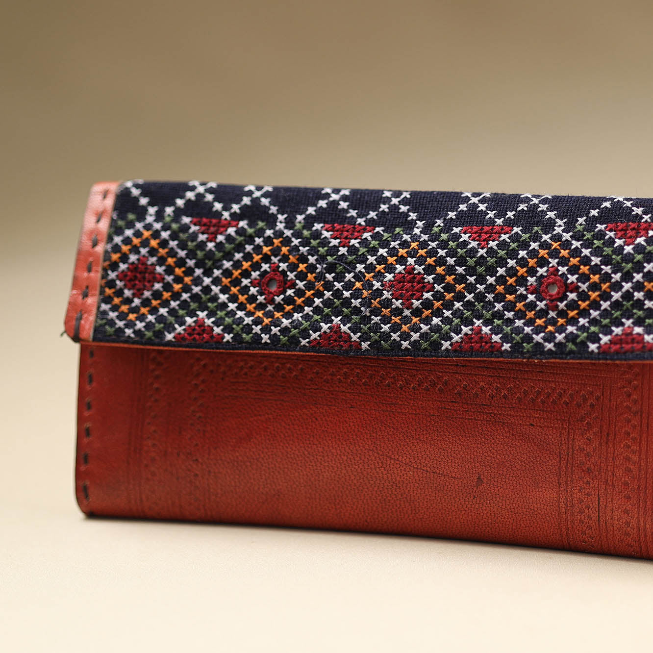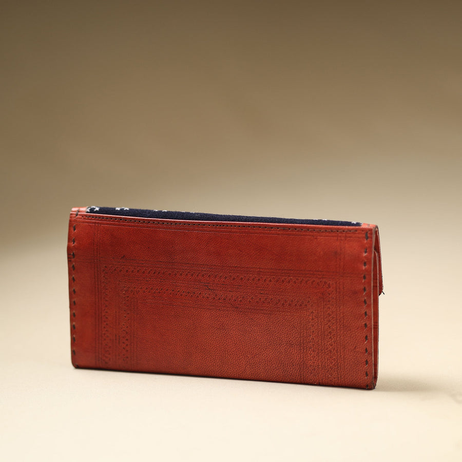 This handcrafted red wallet is made from cruelty-free leather and features intricate kutch work jat embroidery. It has one simple pocket outside, two simple pockets, one zipper pocket, and five card slots inside with a cotton fabric lining, providing ample space for your essentials. It's both stylish and functional.