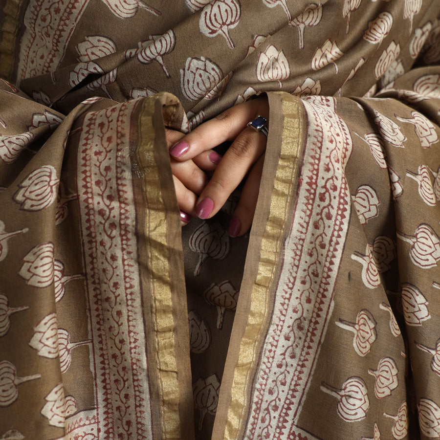 Fine quality akola dabu block printed handloom chanderi silk-cotton dupatta with zari border, made using natural dyes through traditional mud resist process of hand block printing practised by the master artisans in Akola village of Rajasthan. Chanderi silks are known for its gossamer looks and amazing feel.