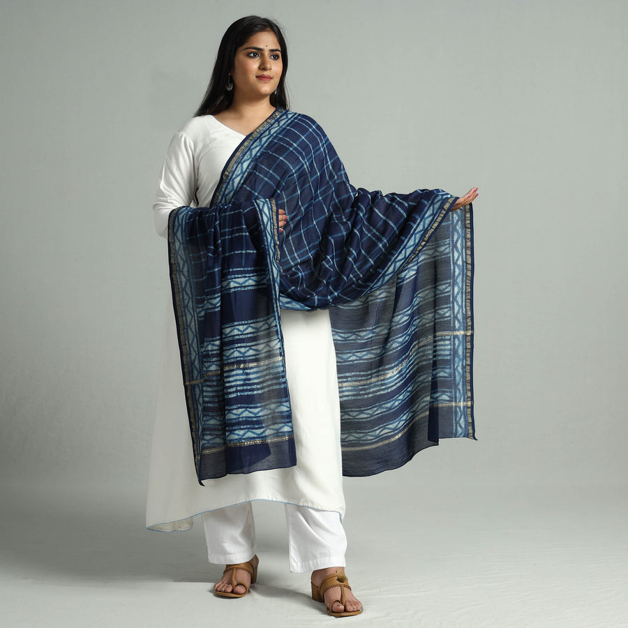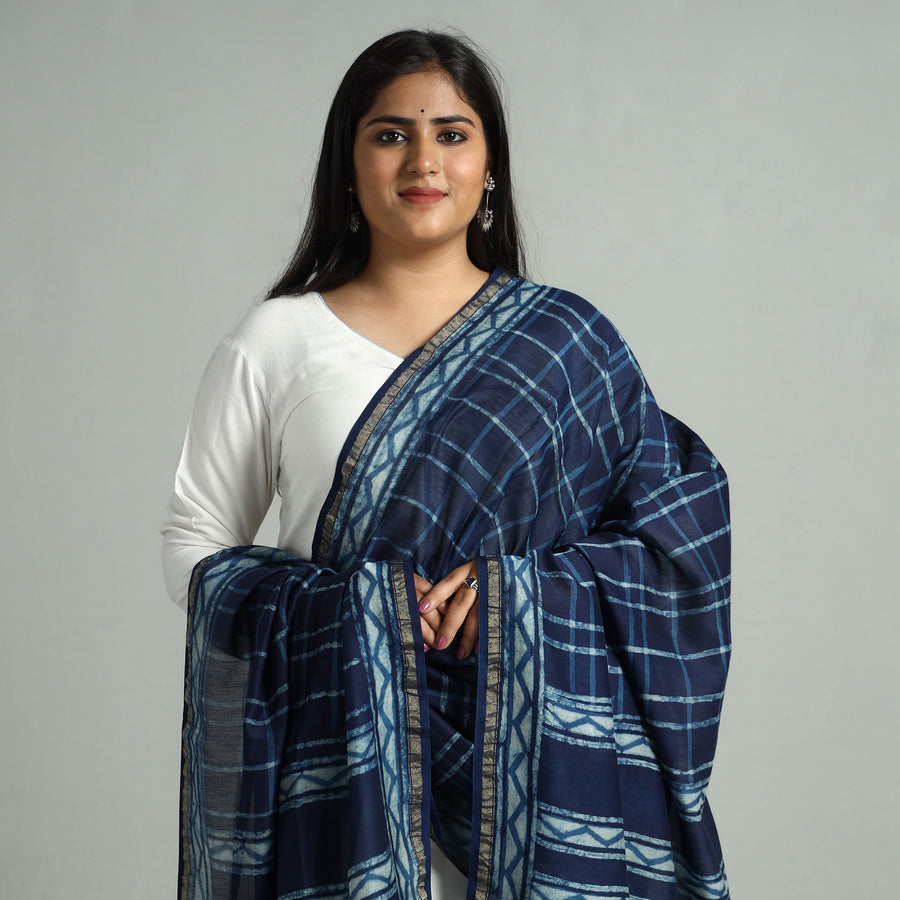 Fine quality akola dabu block printed handloom chanderi silk-cotton dupatta with zari border, made using natural dyes through traditional mud resist process of hand block printing practised by the master artisans in Akola village of Rajasthan. Chanderi silks are known for its gossamer looks and amazing feel.