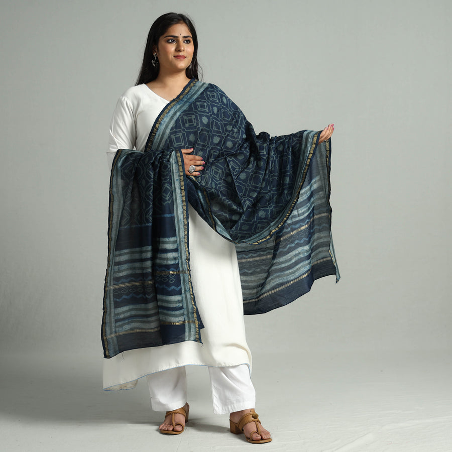 Fine quality akola dabu block printed handloom chanderi silk-cotton dupatta with zari border, made using natural dyes through traditional mud resist process of hand block printing practised by the master artisans in Akola village of Rajasthan. Chanderi silks are known for its gossamer looks and amazing feel.