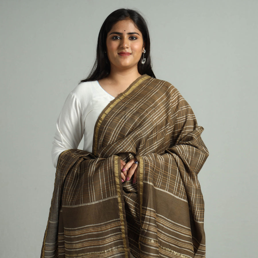 Fine quality akola dabu block printed handloom chanderi silk-cotton dupatta with zari border, made using natural dyes through traditional mud resist process of hand block printing practised by the master artisans in Akola village of Rajasthan. Chanderi silks are known for its gossamer looks and amazing feel.