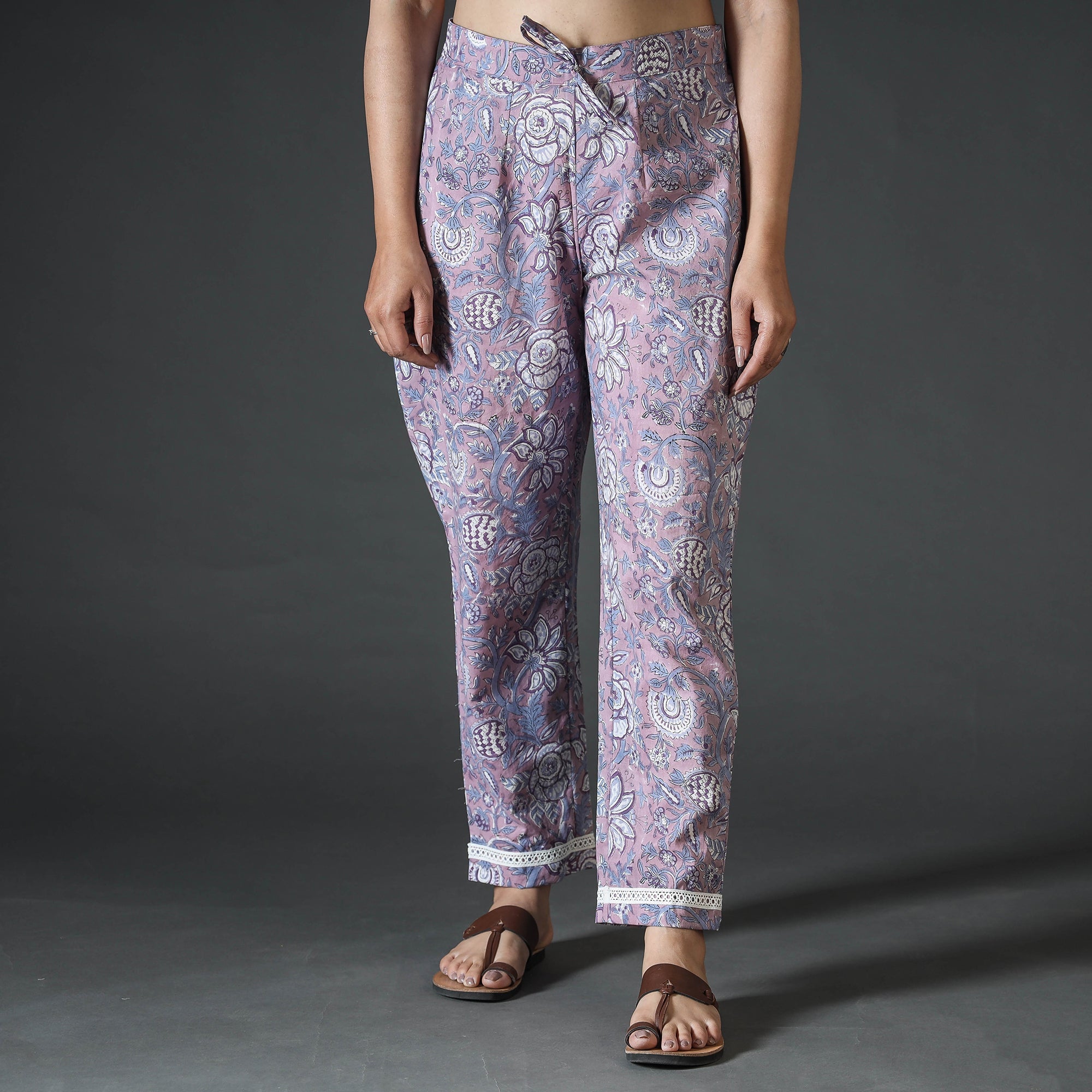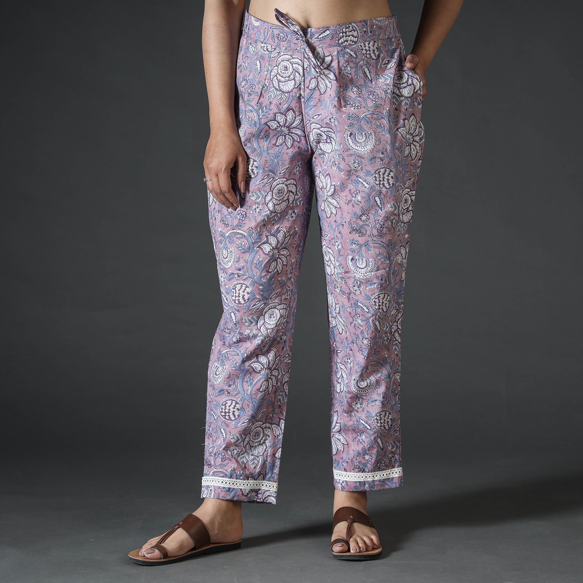 Stay comfortable and stylish in this sanganeri hand block-printed cotton casual pant. This cotton pant features an elasticized waist with a drawstring element that adds to the comfort quotient. The two side pockets add functionality to this pant. The unique hand-block printing technique originating from Sanganer adds a touch of cultural heritage to your look. Bleed-free VAT dyes are used to ensure the color stays vibrant.