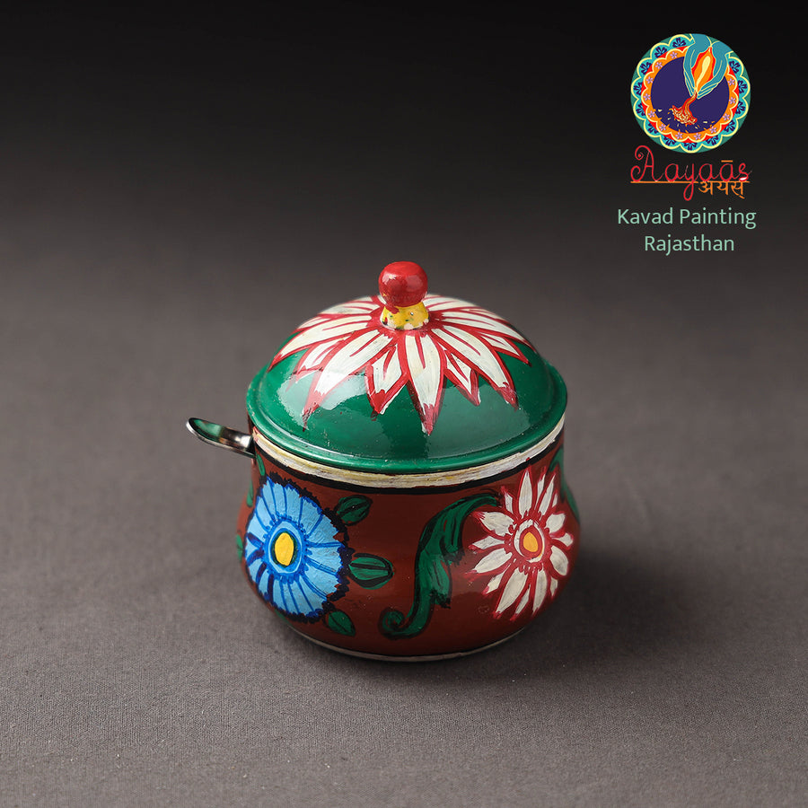 The brown kavad handpainted stainless steel ghee pot is a high-quality kitchen accessory made by skilled artisans from Mewar, Rajasthan. It is crafted from stainless steel and features waterproof oil-based paint, ensuring durability and longevity. The pot comes with a small spoon and is ideal for storing and serving ghee. The traditional design of the pot adds a touch of India to your kitchen, making it both practical and beautiful. It is perfect for those who love traditional Indian kitchenware and want to incorporate it into their daily cooking routine.