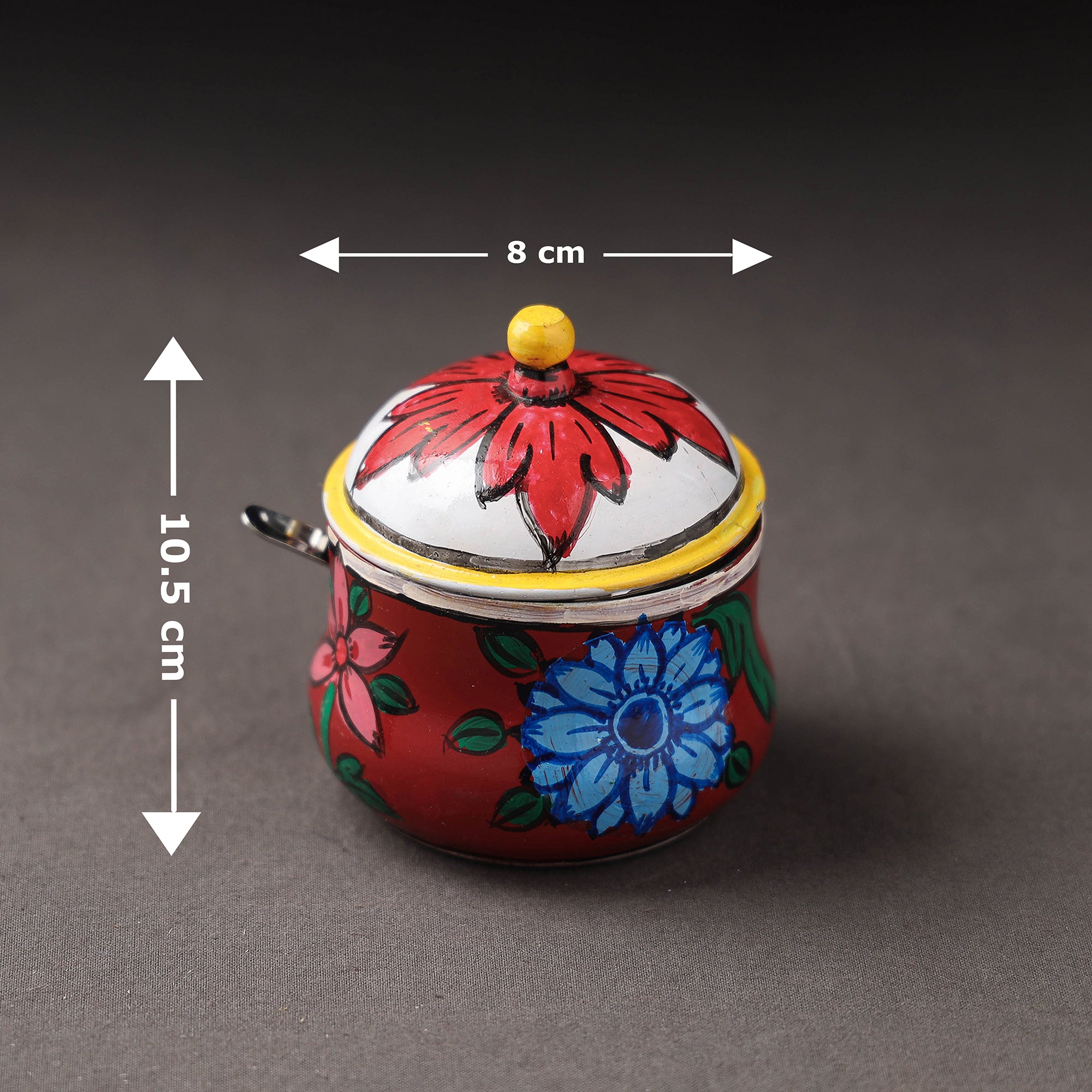 Length - 8 cm, Width - 8 cm, Height - 10.5 cm, Spoon : Length - 10.5 cm, Width - 3 cm.