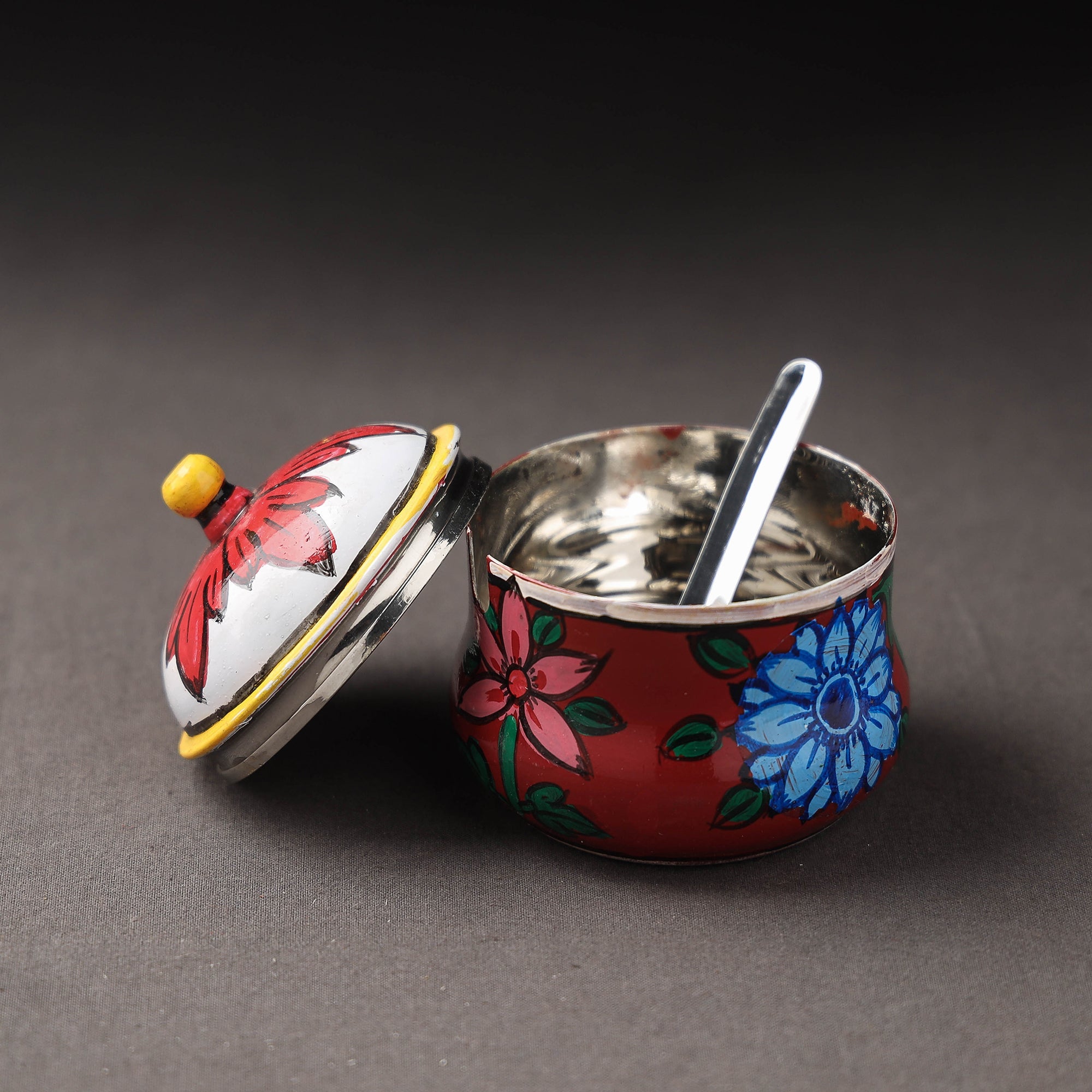 The red kavad handpainted stainless steel ghee pot is a high-quality kitchen accessory made by skilled artisans from Mewar, Rajasthan. It is crafted from stainless steel and features waterproof oil-based paint, ensuring durability and longevity. The pot comes with a small spoon and is ideal for storing and serving ghee. The traditional design of the pot adds a touch of India to your kitchen, making it both practical and beautiful. It is perfect for those who love traditional Indian kitchenware and want to incorporate it into their daily cooking routine.
