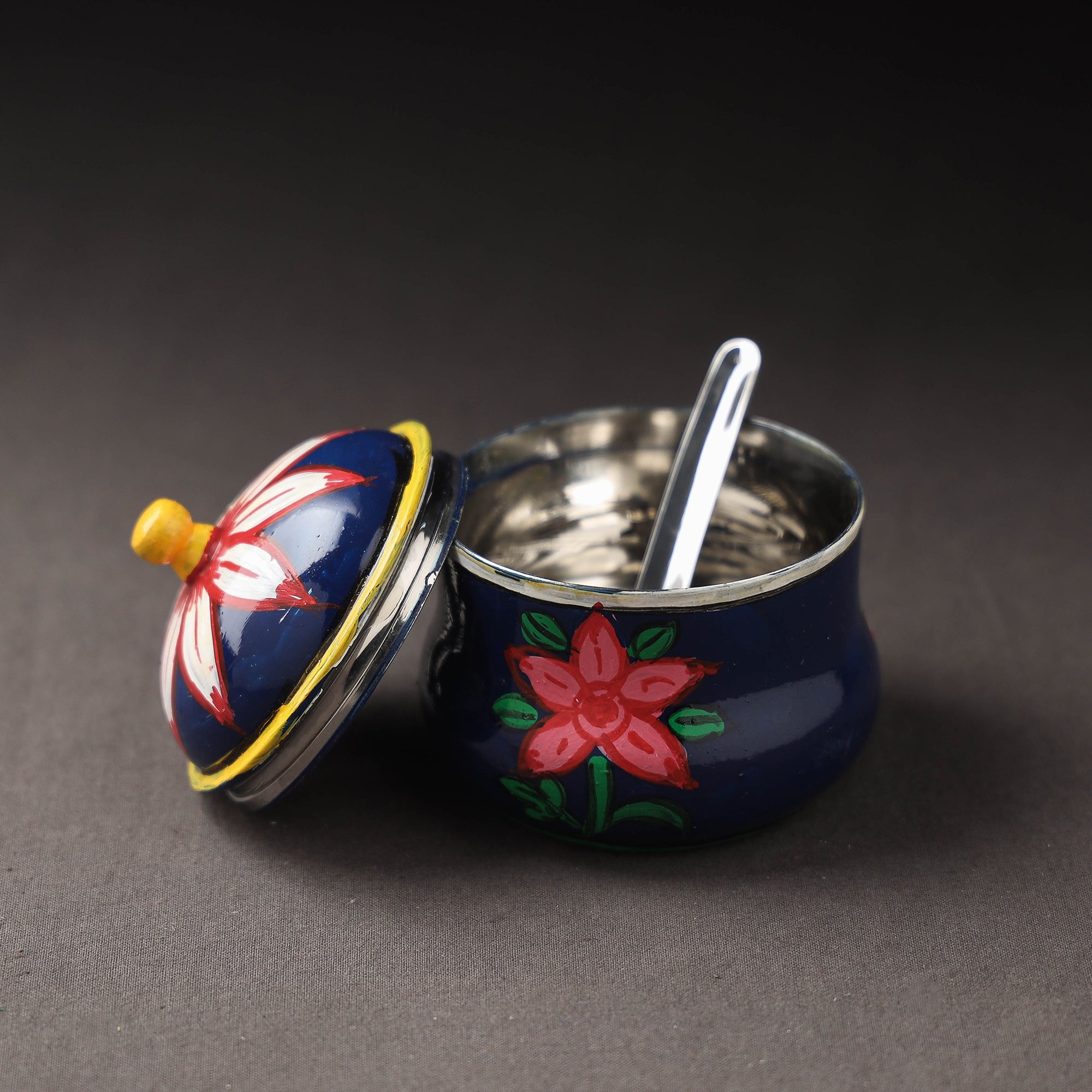 The blue kavad handpainted stainless steel ghee pot is a high-quality kitchen accessory made by skilled artisans from Mewar, Rajasthan. It is crafted from stainless steel and features waterproof oil-based paint, ensuring durability and longevity. The pot comes with a small spoon and is ideal for storing and serving ghee. The traditional design of the pot adds a touch of India to your kitchen, making it both practical and beautiful. It is perfect for those who love traditional Indian kitchenware and want to incorporate it into their daily cooking routine.