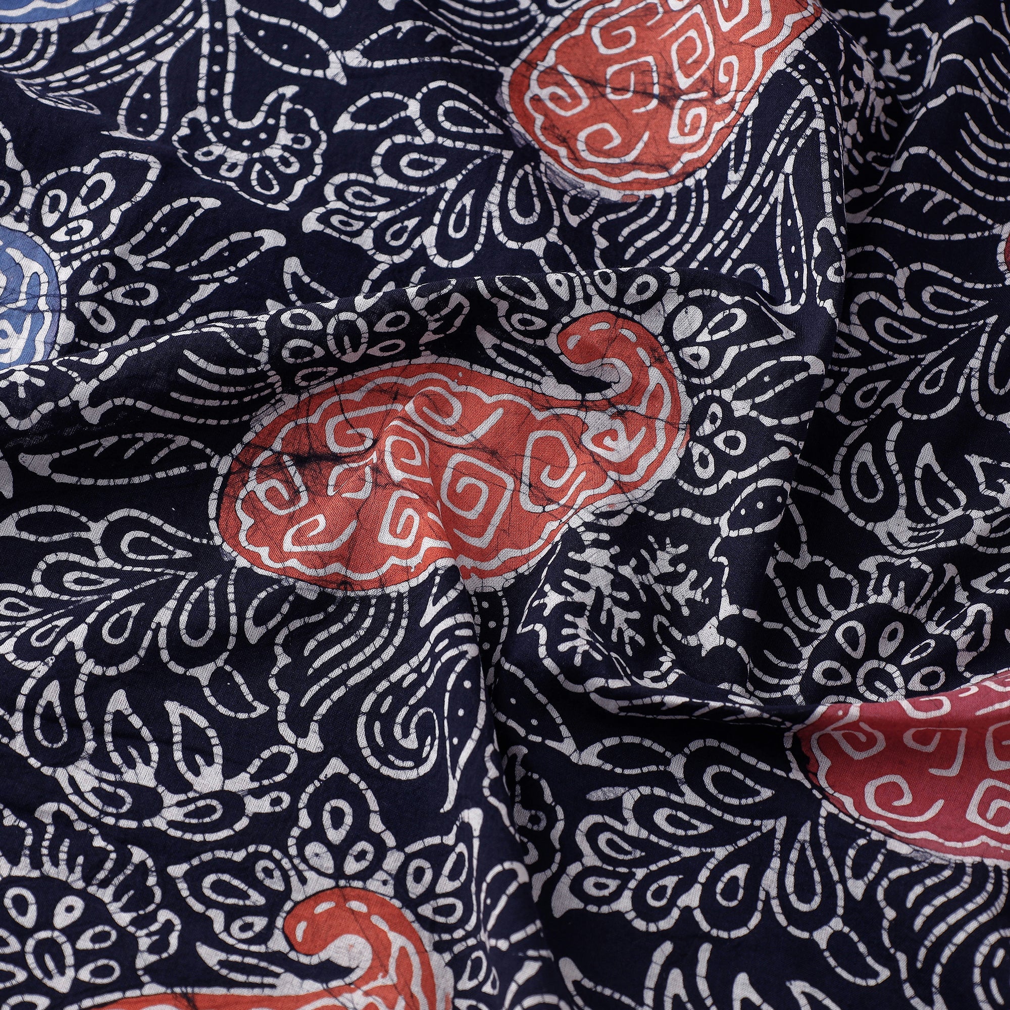 This is a fine quality pure cotton fabric hand batik printed in Indonesian style, sourced from Ujjain, Madhya Pradesh. Batik is a wax-resist dyeing technique used on whole cloth, or cloth made using this technique. The traditional Indian batik designs and motifs are passed down through generations.
