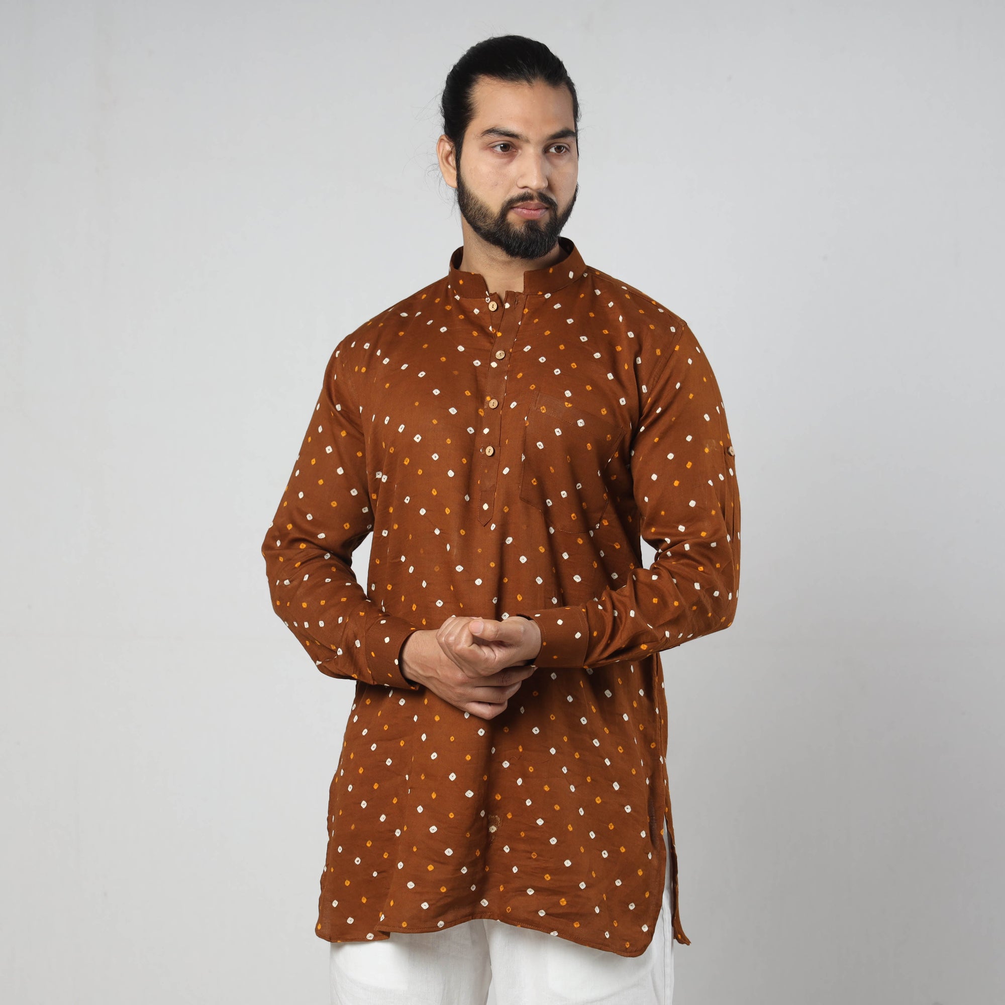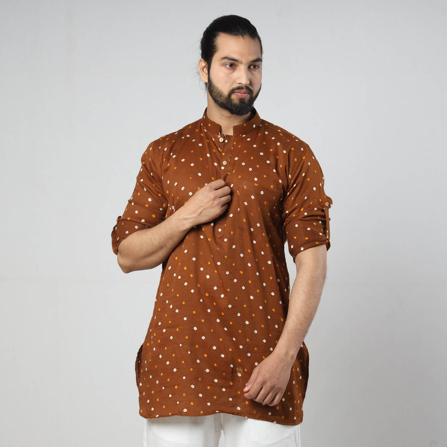 | Material | Look and feel beautiful in this uniquely designed bandhani tie-dye cotton men's short kurta with two side pockets that makes you comfortable with ease all day long. It's made from bandhani tie-dye soft cotton fabric featuring the majestic bandhani pattern, tie-dyed using the traditional technique practised by skilled artisans and their families in Kutch. This kurta features full sleeves, stand collar and a button placket which makes it perfect for your daily outings as well as for any special occasion. |