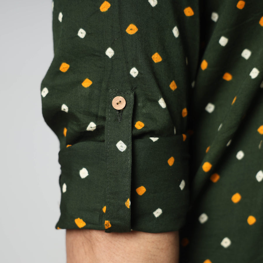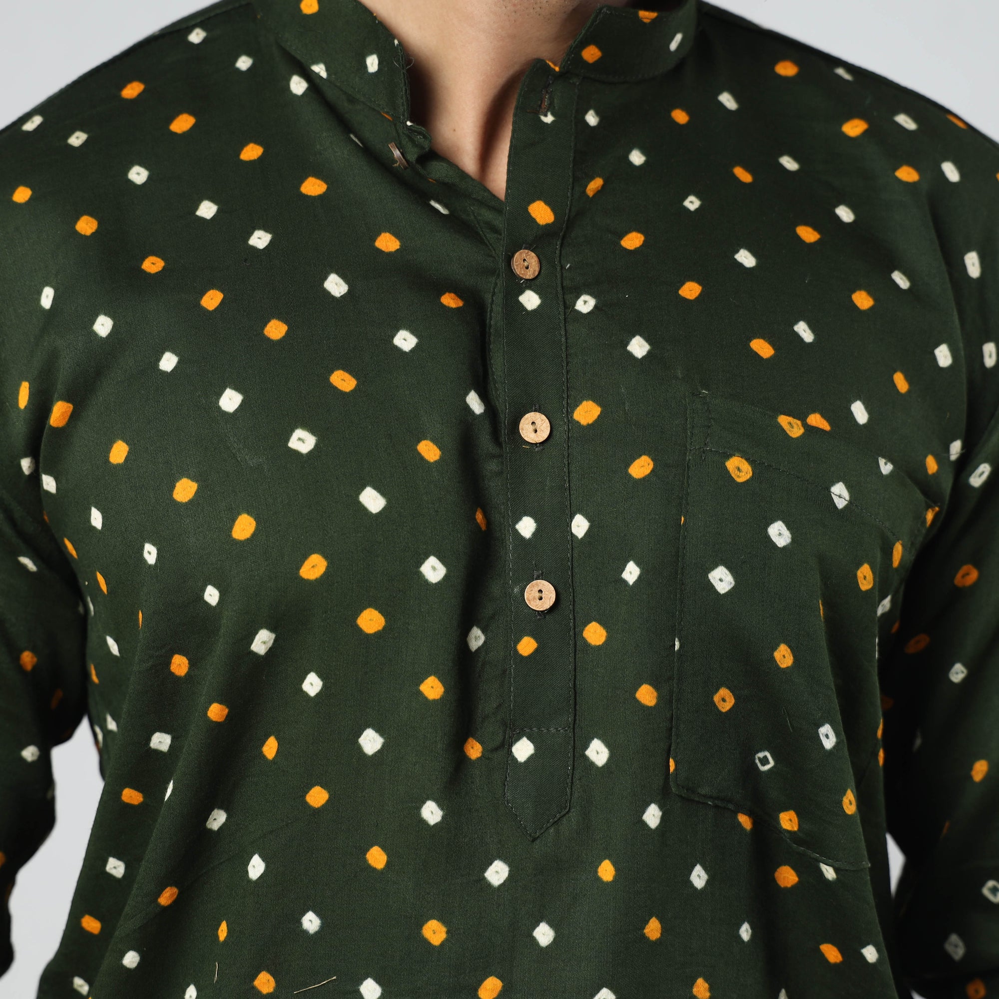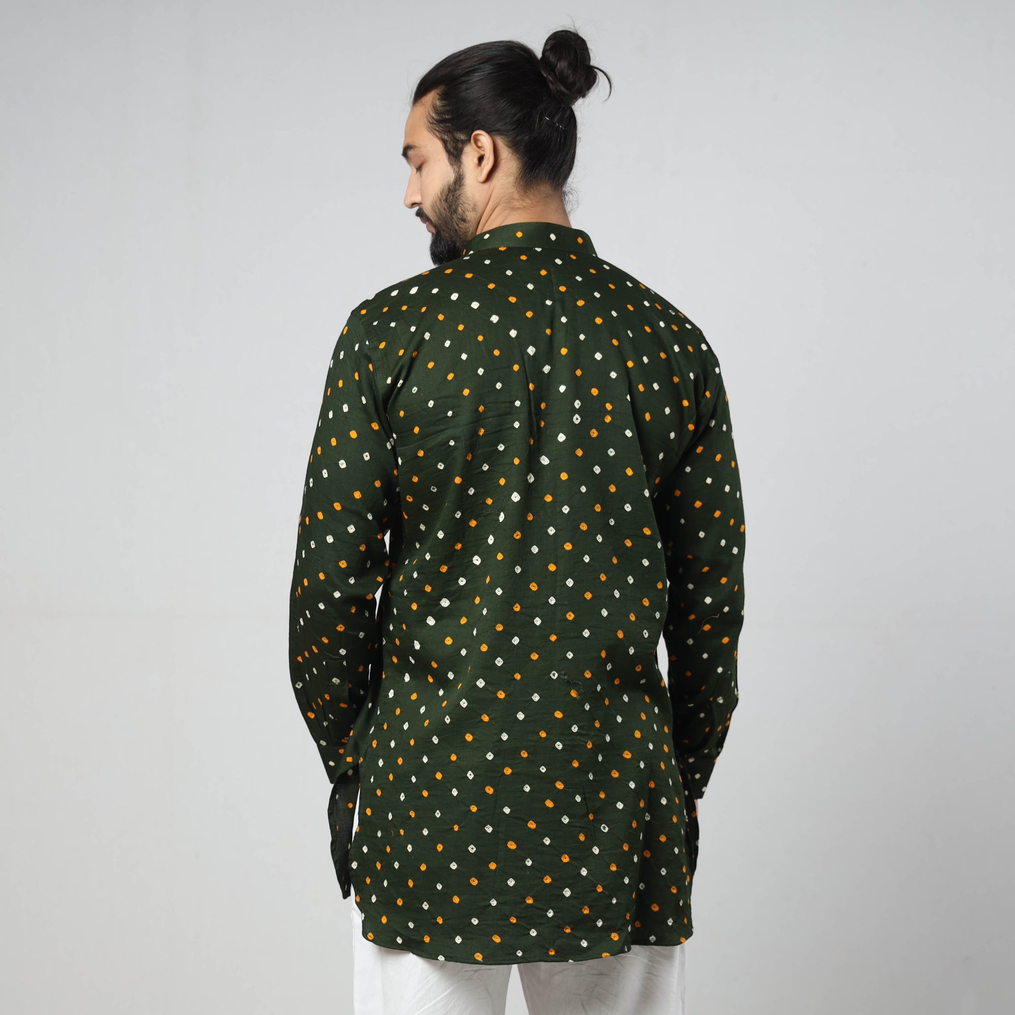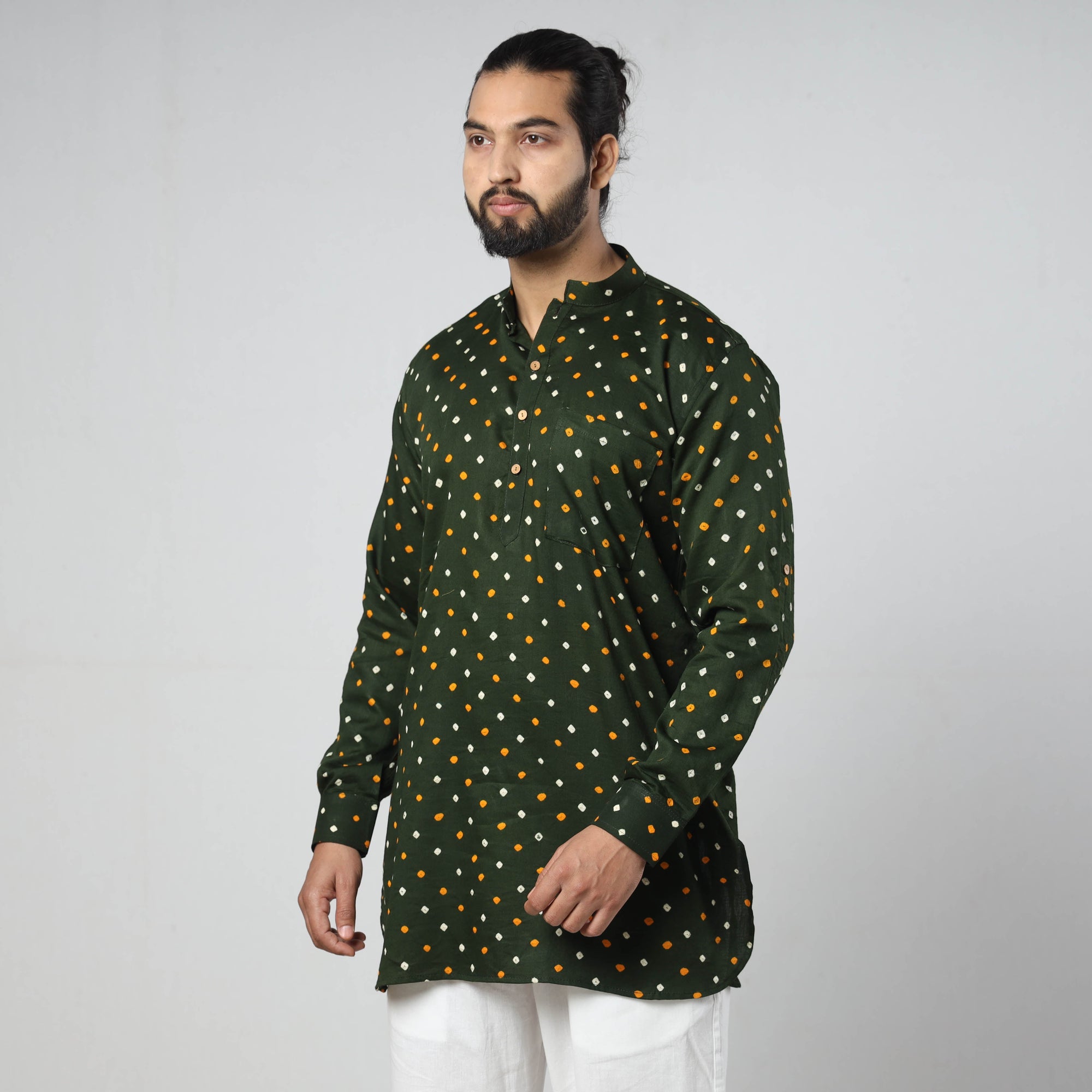 | Material | Look and feel beautiful in this uniquely designed bandhani tie-dye cotton men's short kurta with two side pockets that makes you comfortable with ease all day long. It's made from bandhani tie-dye soft cotton fabric featuring the majestic bandhani pattern, tie-dyed using the traditional technique practised by skilled artisans and their families in Kutch. This kurta features full sleeves, stand collar and a button placket which makes it perfect for your daily outings as well as for any special occasion. |