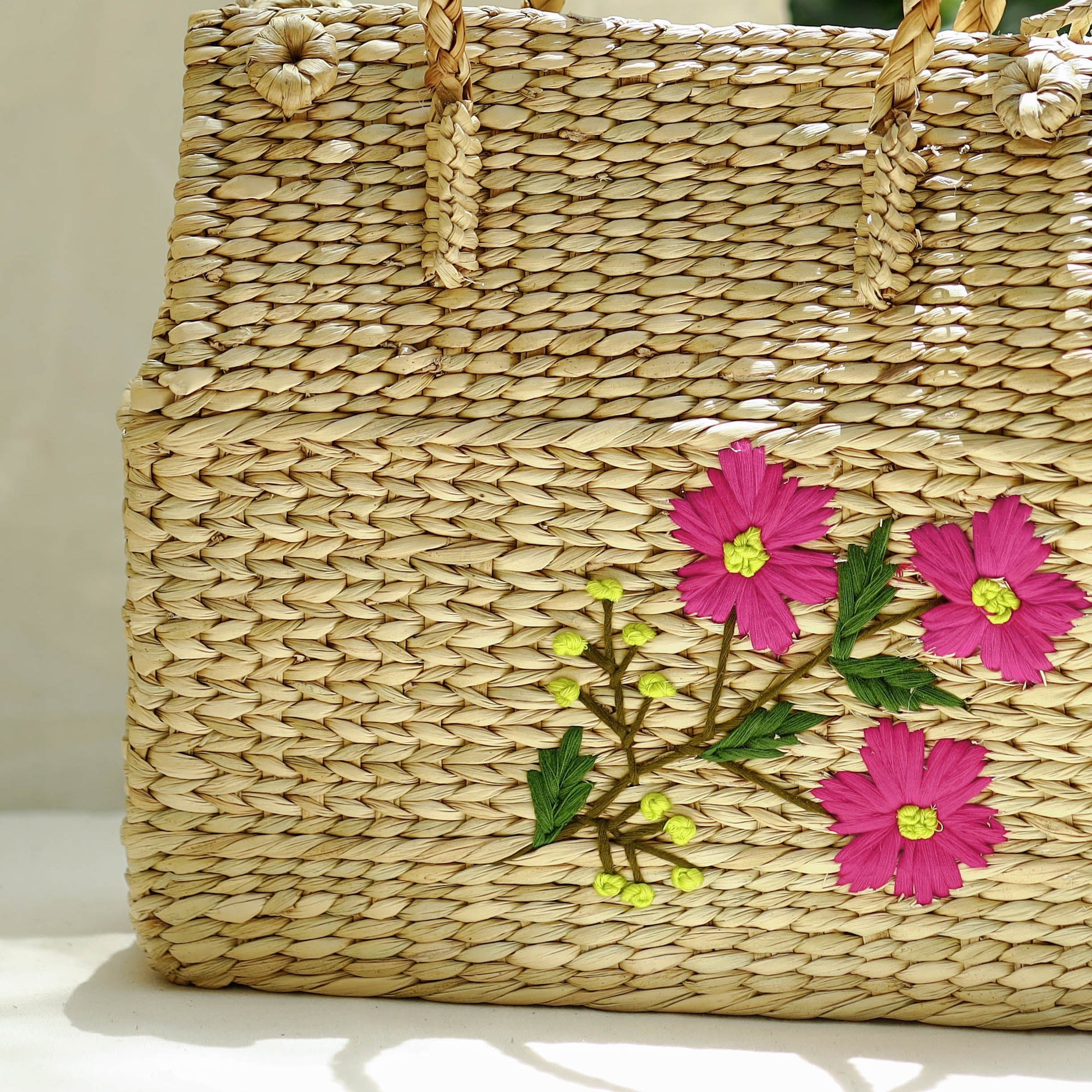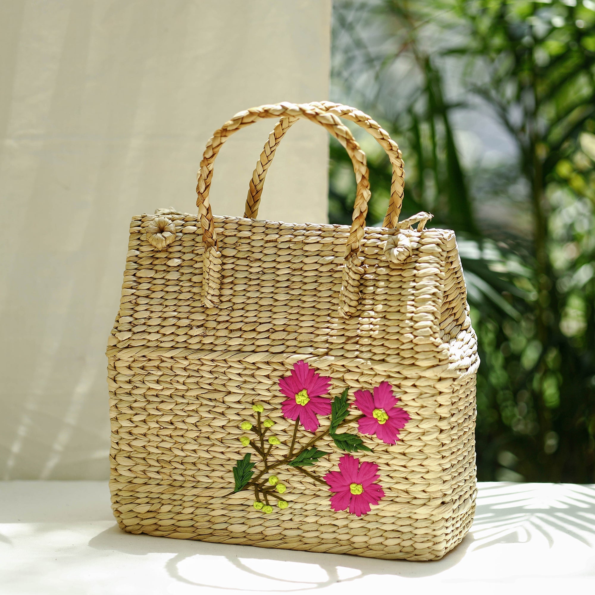 This exquisite beige handcrafted shopping bag from Manipur is made of natural water reed and adorned with intricate hand embroidery. The bag showcases the rich cultural heritage of Manipur, known for its traditional craftsmanship. Made from durable and eco-friendly water reed, the bag is perfect for everyday use. It offers ample space for groceries, books, or as a stylish alternative to plastic bags. The vibrant hand embroidery adds an artistic touch, depicting traditional patterns and nature-inspired designs. With sturdy handles and a secure closure, this bag combines traditional charm with contemporary style, making it a versatile and fashionable accessory for any occasion.