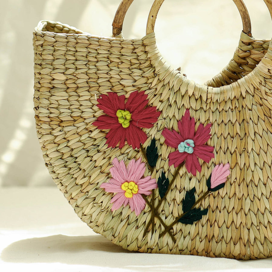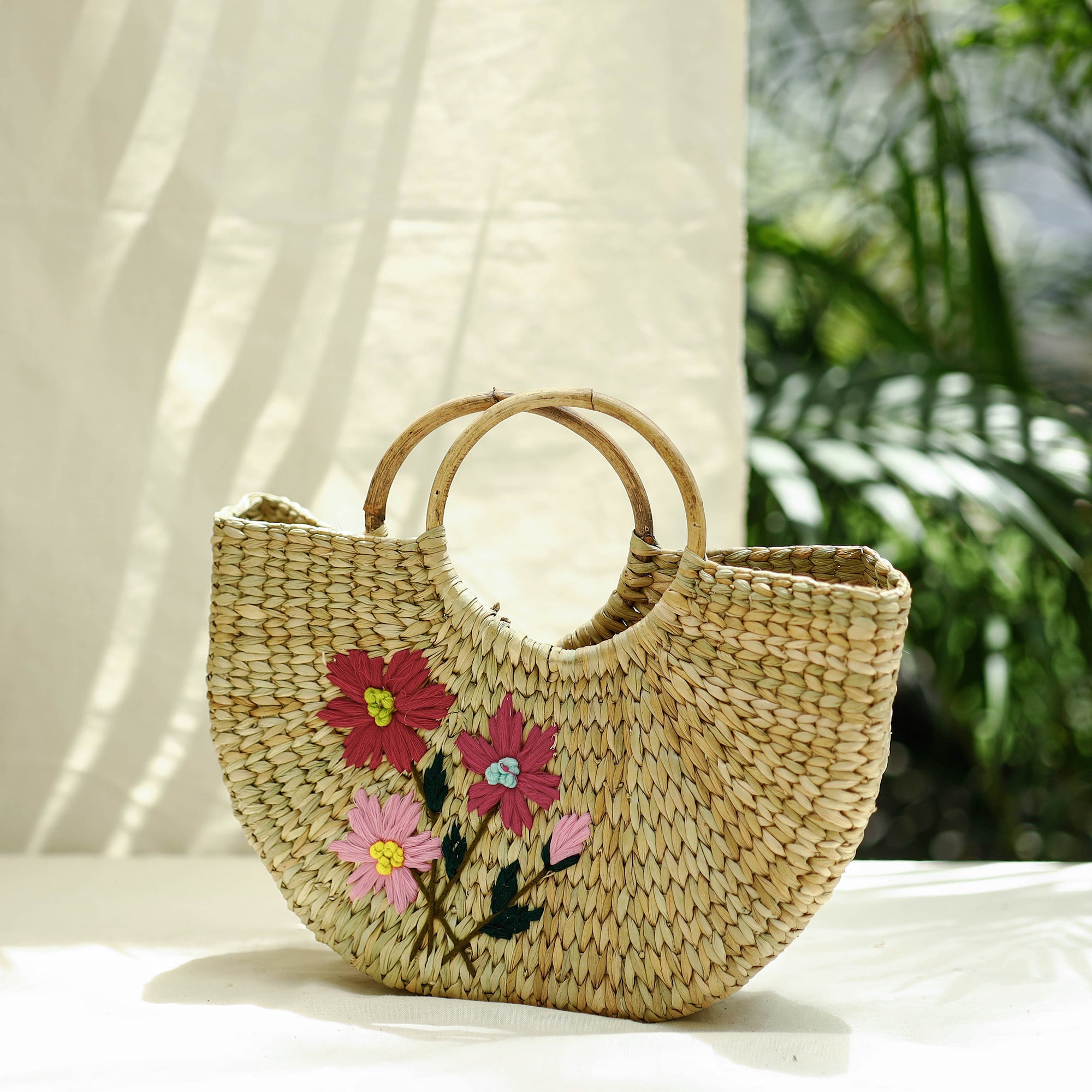This exquisite beige handcrafted hand bag from Manipur is made of natural water reed and adorned with intricate hand embroidery. The bag showcases the rich cultural heritage of Manipur, known for its traditional craftsmanship. Made from durable and eco-friendly water reed, the bag is perfect for everyday use. it offers ample room for your essentials. The vibrant hand embroidery adds an artistic touch, depicting traditional patterns and nature-inspired designs. With sturdy handles and a secure closure, this bag combines traditional charm with contemporary style, making it a versatile and fashionable accessory for any occasion.