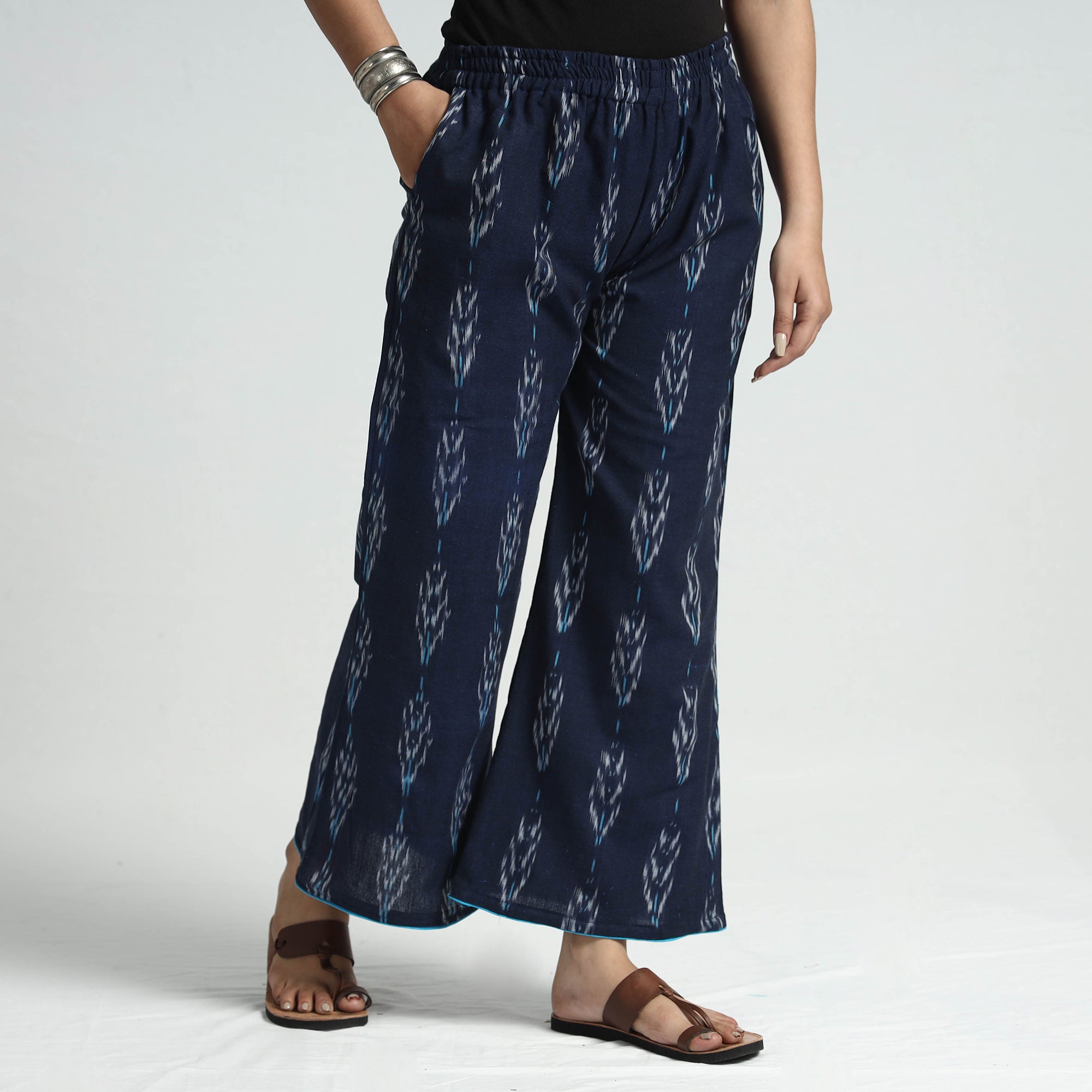 Stay comfortable and stylish in this pochampally ikat weave cotton palazzo. Made from cotton fabric. This palazzo offers the perfect blend of comfort and style. The elasticized waist ensures a great fit, while the two side pockets add functionality. This palazzo makes you feel comfortable and stylish all day long and is perfect for your daily outings and special occasions.