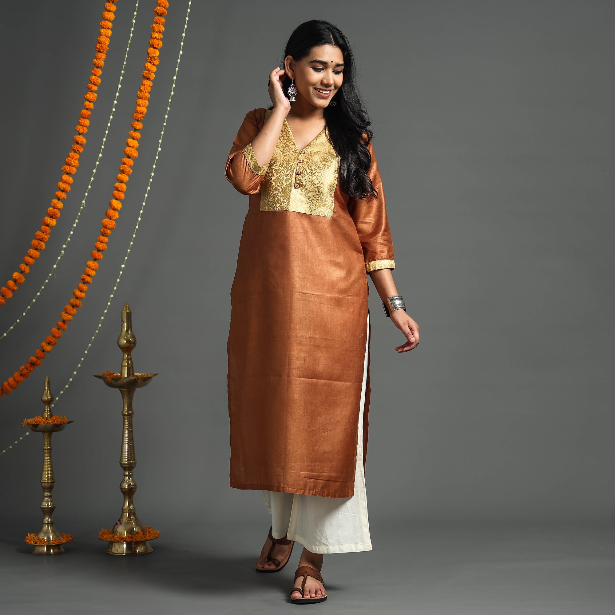 Brown - Plain Tussar Silk Handloom Banarasi Patchwork Straight Kurta