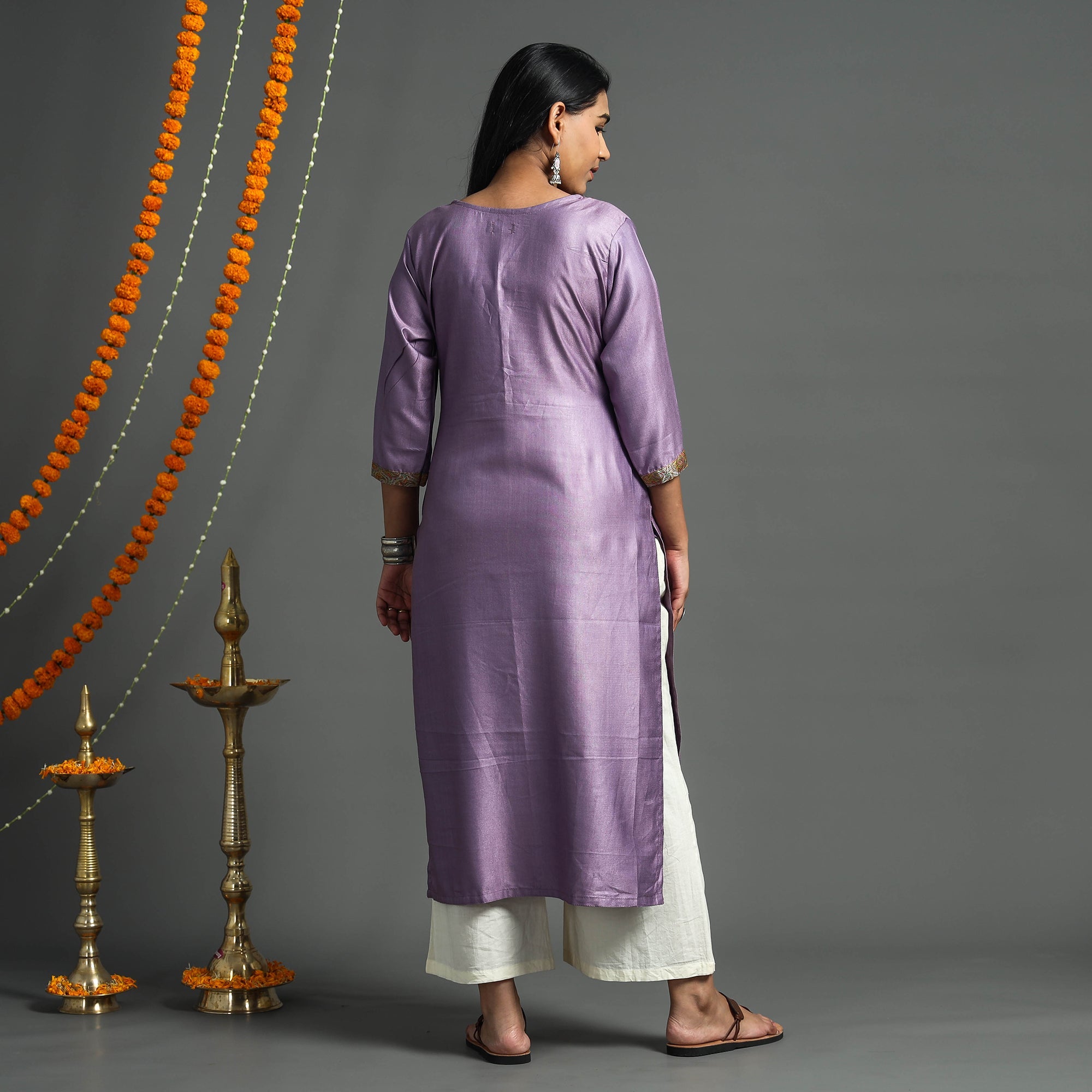Fine quality plain tussar silk handloom banarasi patchwork kurta with side pocket. This long kurta is crafted from high-quality tussar silk fabric, ensuring a luxurious and comfortable feel against your skin. Tussar silk is known for its unique texture, sheen of silk and feel of cotton. A perfect blend of both worlds completely suitable for all weathers. Exquisite collection of pure handwoven tussar silk kurtas that showcases beautifully handwoven textures.