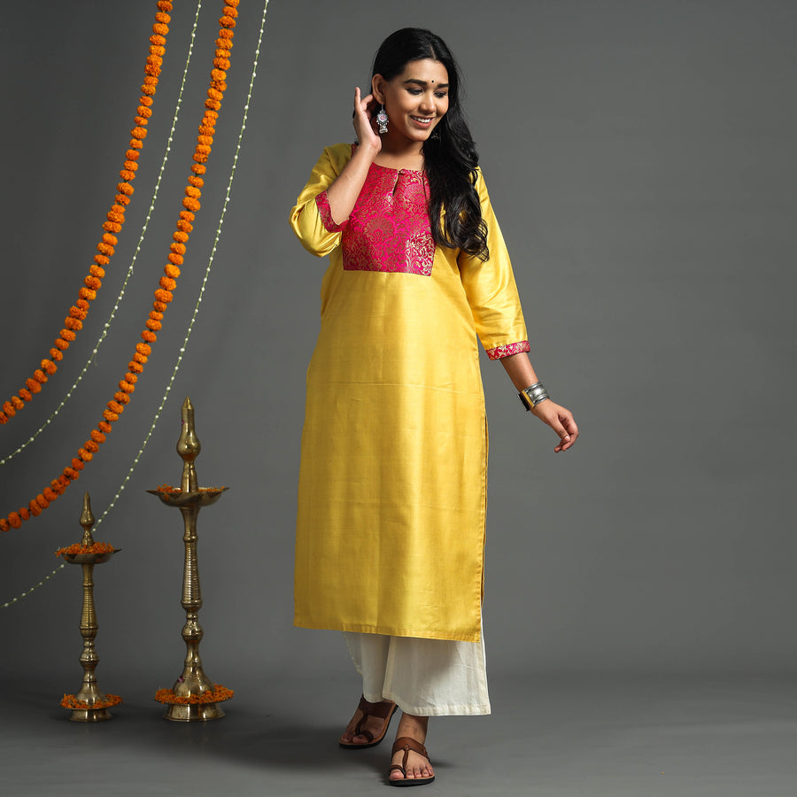 Fine quality plain tussar silk handloom banarasi patchwork kurta with side pocket. This long kurta is crafted from high-quality tussar silk fabric, ensuring a luxurious and comfortable feel against your skin. Tussar silk is known for its unique texture, sheen of silk and feel of cotton. A perfect blend of both worlds completely suitable for all weathers. Exquisite collection of pure handwoven tussar silk kurtas that showcases beautifully handwoven textures.