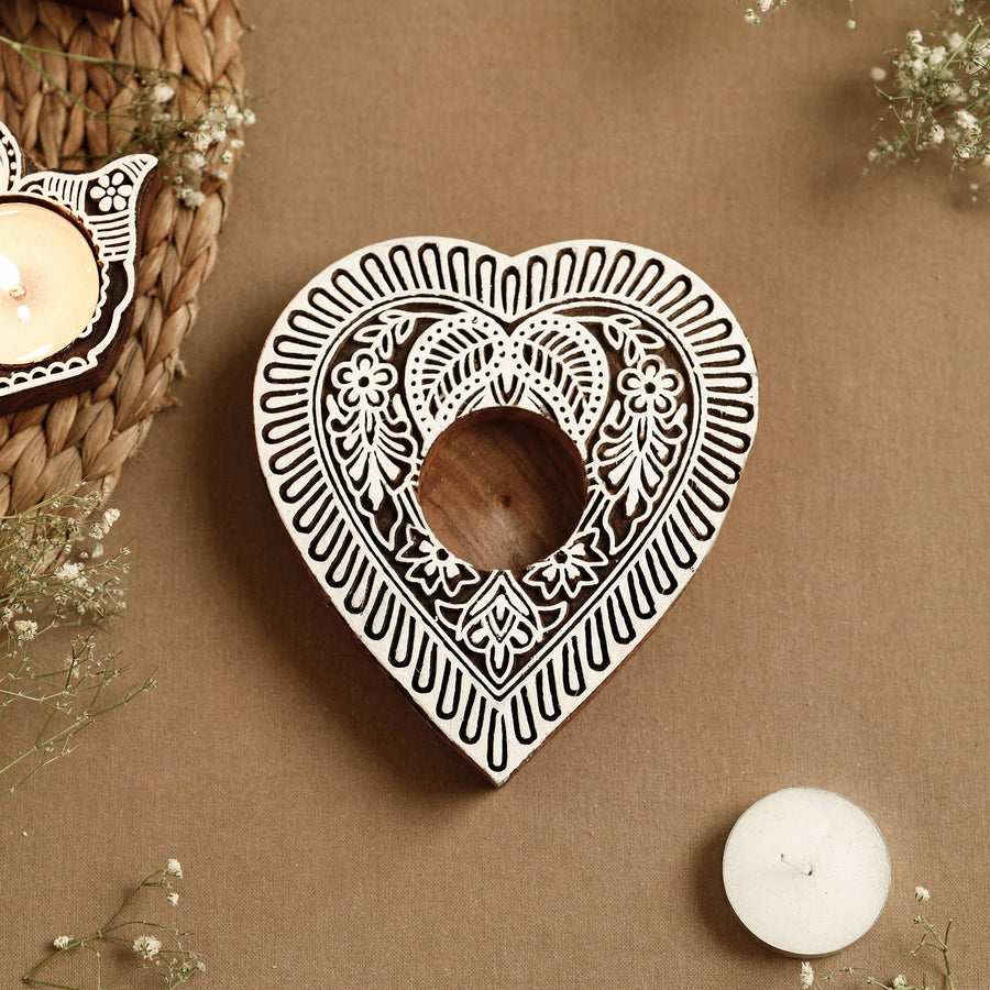 Intricately carved natural sheesham wood block tealight candle holder. Motifs are carefully engraved onto flat and smooth blocks of wood by skilful hands. This tea-light candle holder doesn’t just light up your homes, offices or restaurants, but it can also be used for block printing on fabric, paper, canvas, etc.
