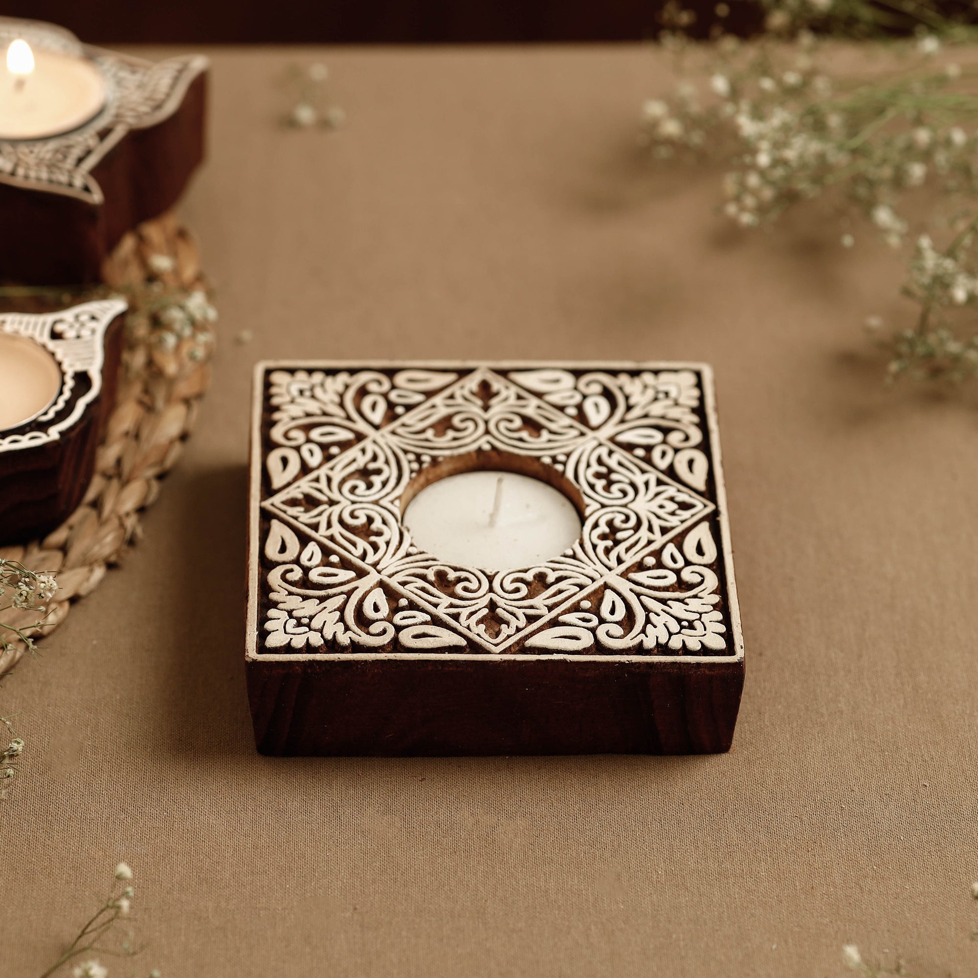 Intricately carved natural sheesham wood block tealight candle holder. Motifs are carefully engraved onto flat and smooth blocks of wood by skilful hands. This tea-light candle holder doesn’t just light up your homes, offices or restaurants, but it can also be used for block printing on fabric, paper, canvas, etc.