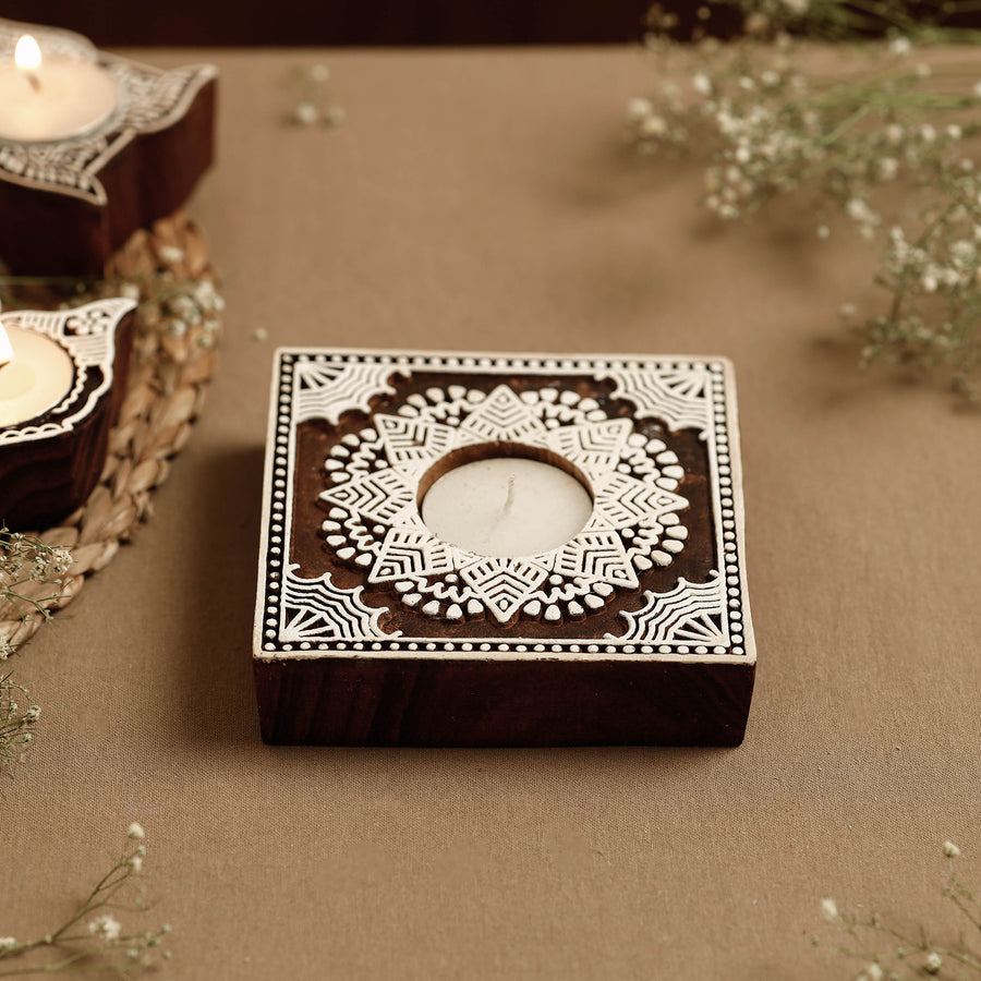 Intricately carved natural sheesham wood block tealight candle holder. Motifs are carefully engraved onto flat and smooth blocks of wood by skilful hands. This tea-light candle holder doesn’t just light up your homes, offices or restaurants, but it can also be used for block printing on fabric, paper, canvas, etc.