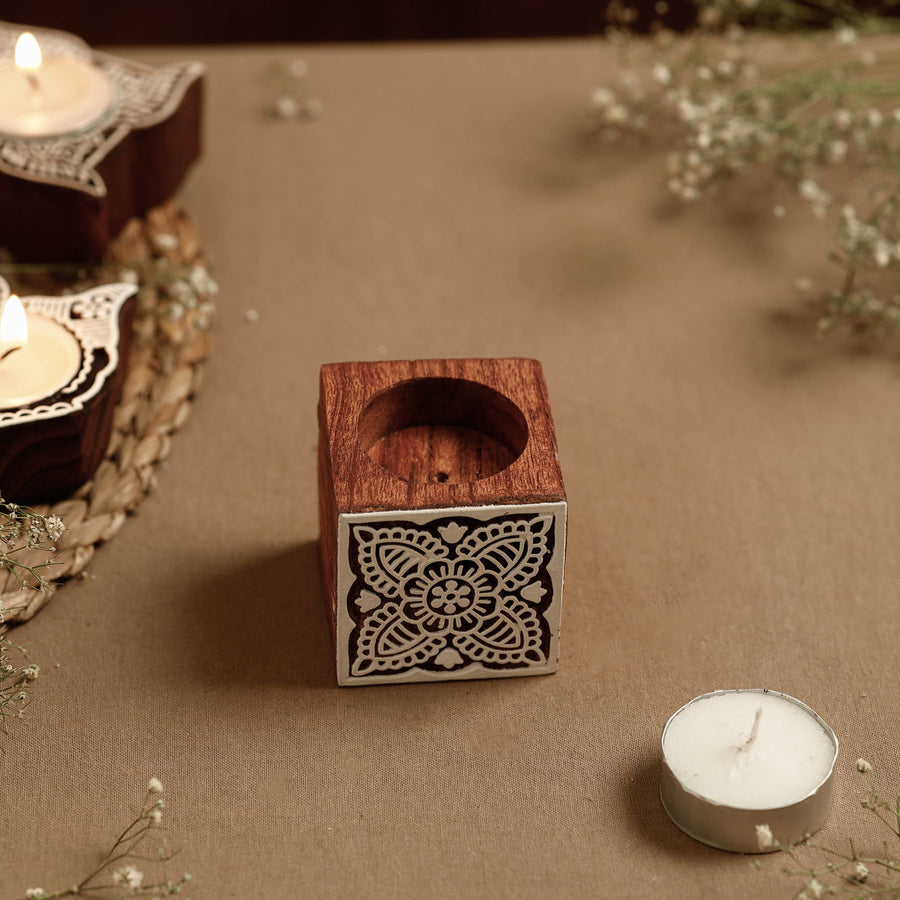 Intricately carved natural sheesham wood block tealight candle holder. Motifs are carefully engraved onto flat and smooth blocks of wood by skilful hands. This tea-light candle holder doesn’t just light up your homes, offices or restaurants, but it can also be used for block printing on fabric, paper, canvas, etc.