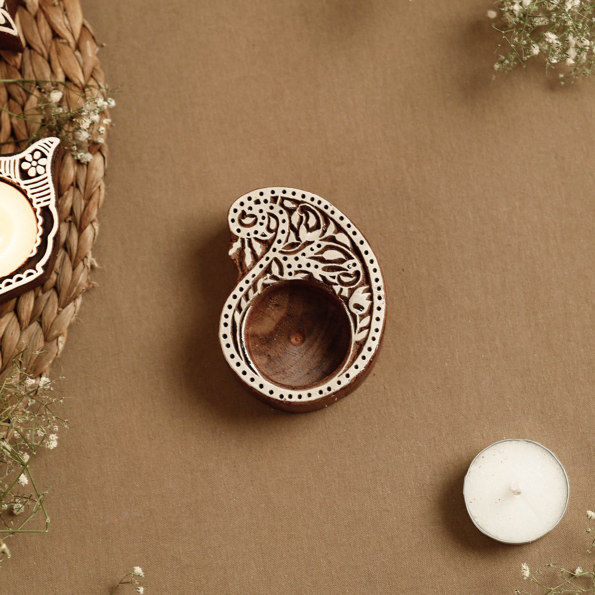 Intricately carved natural sheesham wood block tealight candle holder. Motifs are carefully engraved onto flat and smooth blocks of wood by skilful hands. This tea-light candle holder doesn’t just light up your homes, offices or restaurants, but it can also be used for block printing on fabric, paper, canvas, etc.