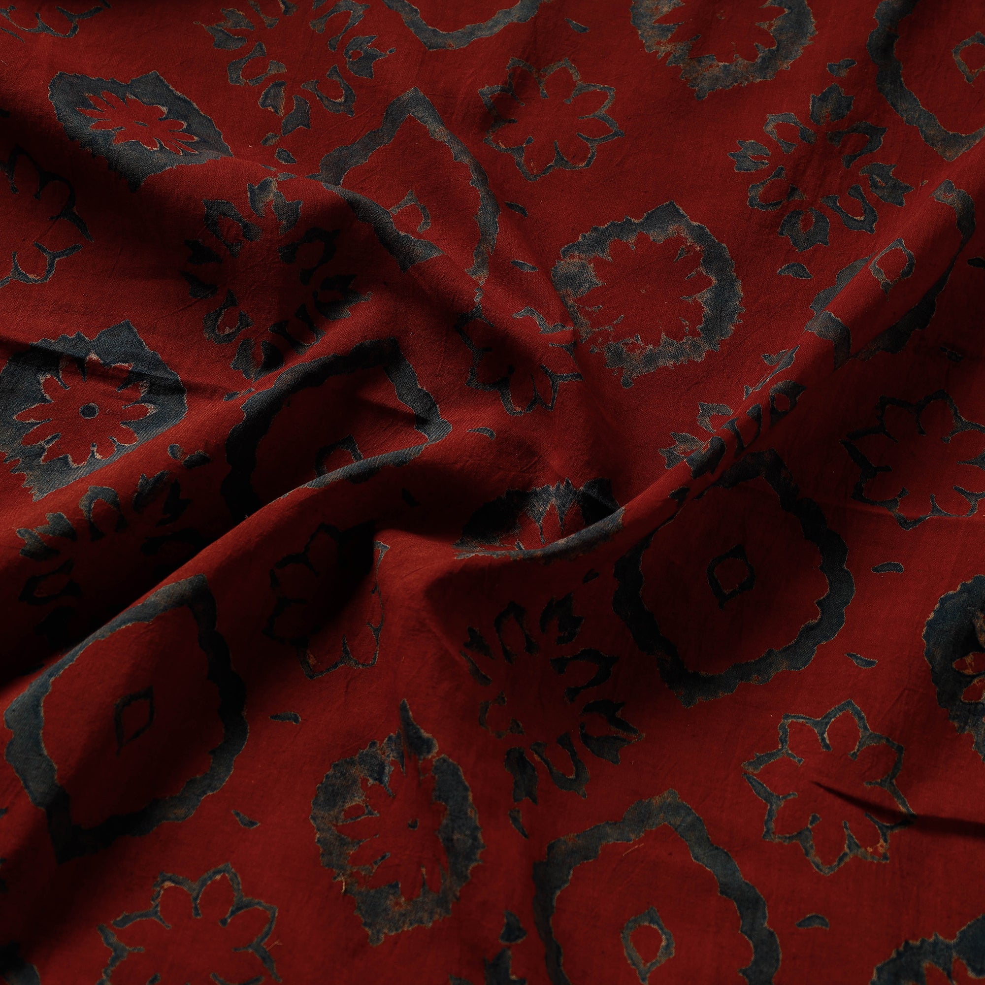 Fine quality bold red ajrakh block printing cotton fabric made using natural dyes through traditional ajrakh technique of hand-block printing practised by the artisans in Kutch region of Gujarat.Ajrakh is a traditional vegetable dyeing and resist block-printing technique on cloth. It is estimated to be around 4,500 years old. The Ajrakh artisans in India are originally from Sindh and they migrated to Kutch in Gujarat and Barmer in Rajasthan. Ajrakh is the traditional attire of the Maldhari pastoral community of Bhuj. The process of 'Ajrakh' is a long drawn process with many stages and each layer of colour is printed after a gap of time so the cloth has to stay for the day.