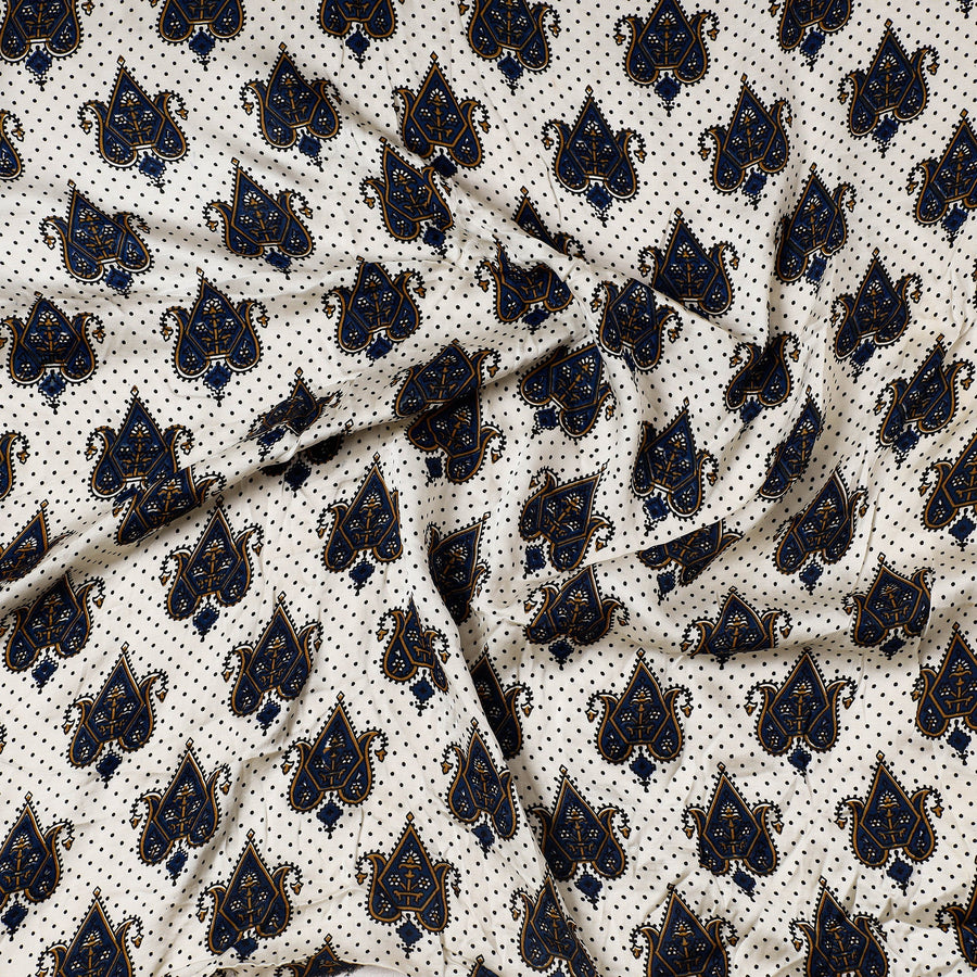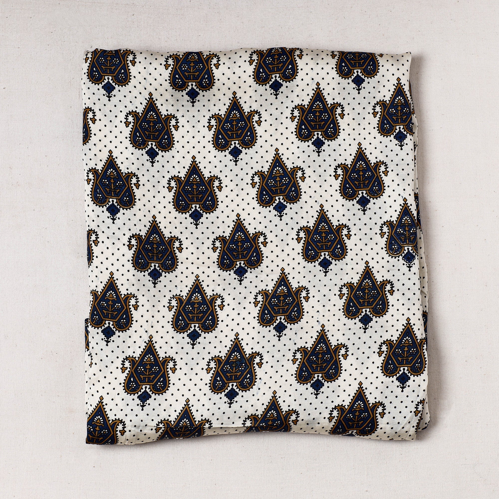This is a fine quality white ajrakh block printed modal silk precut fabric, made through the traditional process of hand block printing by artisans in Kutch region of Gujarat. It features natural dyes and is crafted using a blend of modal fibers and silk yarns, resulting in a soft, shiny, and lustrous fabric that combines the opulence of silk with the comfort of cotton.