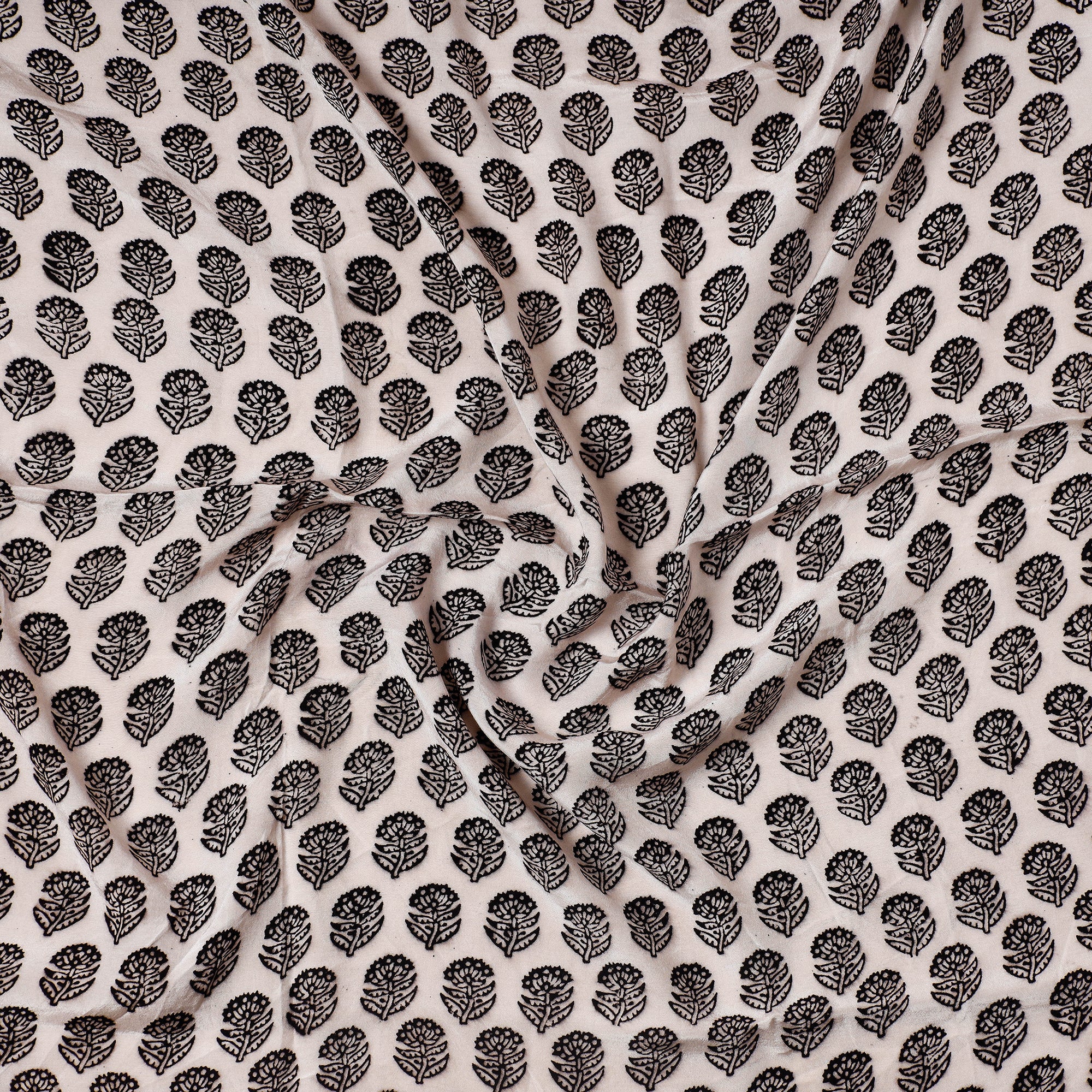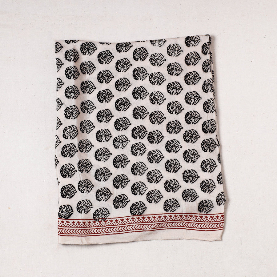This is a fine quality white precut fabric made from modal silk, featuring intricate bagh block prints crafted by master artisan Umar Faruk Khatri. The traditional hand block printing technique is used in the making of this fabric, giving it a unique and exquisite look. Bagh is a village located in the Dhar district of Madhya Pradesh known for its highly skilled artisans and the intricate block printing technique practiced there.