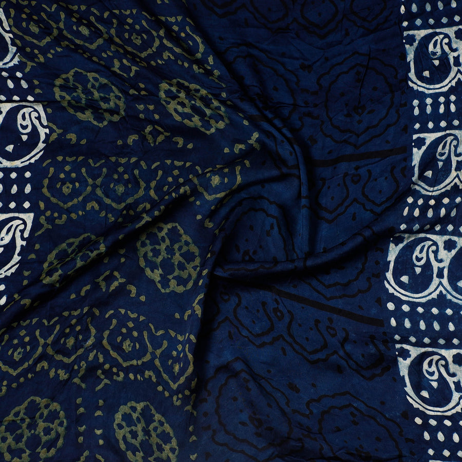 This is a fine quality blue ajrakh block printed modal silk precut fabric, made through the traditional process of hand block printing by artisans in Kutch region of Gujarat. It features natural dyes and is crafted using a blend of modal fibers and silk yarns, resulting in a soft, shiny, and lustrous fabric that combines the opulence of silk with the comfort of cotton.