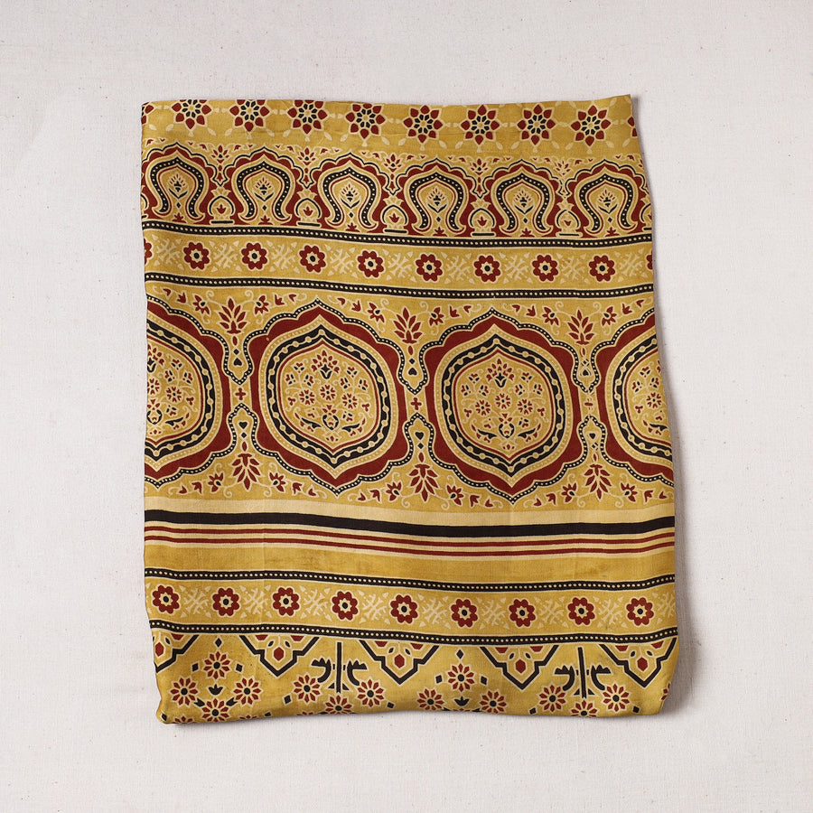 This is a fine quality yellow ajrakh block printed modal silk precut fabric, made through the traditional process of hand block printing by artisans in Kutch region of Gujarat. It features natural dyes and is crafted using a blend of modal fibers and silk yarns, resulting in a soft, shiny, and lustrous fabric that combines the opulence of silk with the comfort of cotton.