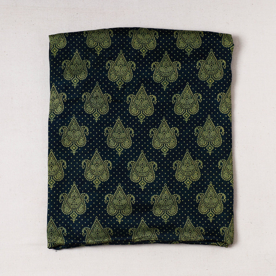 This is a fine quality green ajrakh block printed modal silk precut fabric, made through the traditional process of hand block printing by artisans in Kutch region of Gujarat. It features natural dyes and is crafted using a blend of modal fibers and silk yarns, resulting in a soft, shiny, and lustrous fabric that combines the opulence of silk with the comfort of cotton.