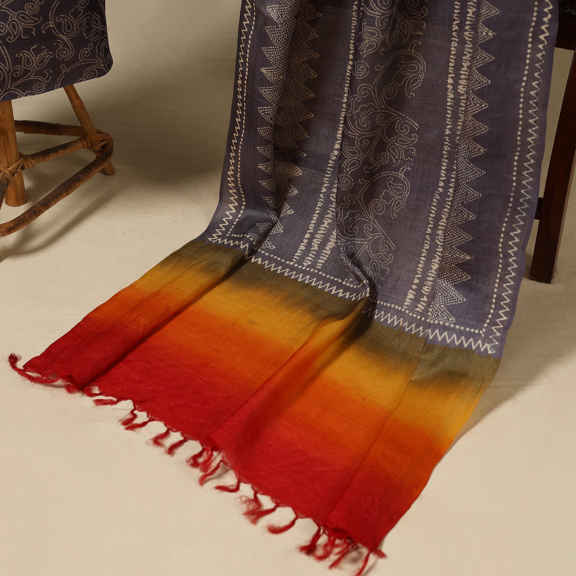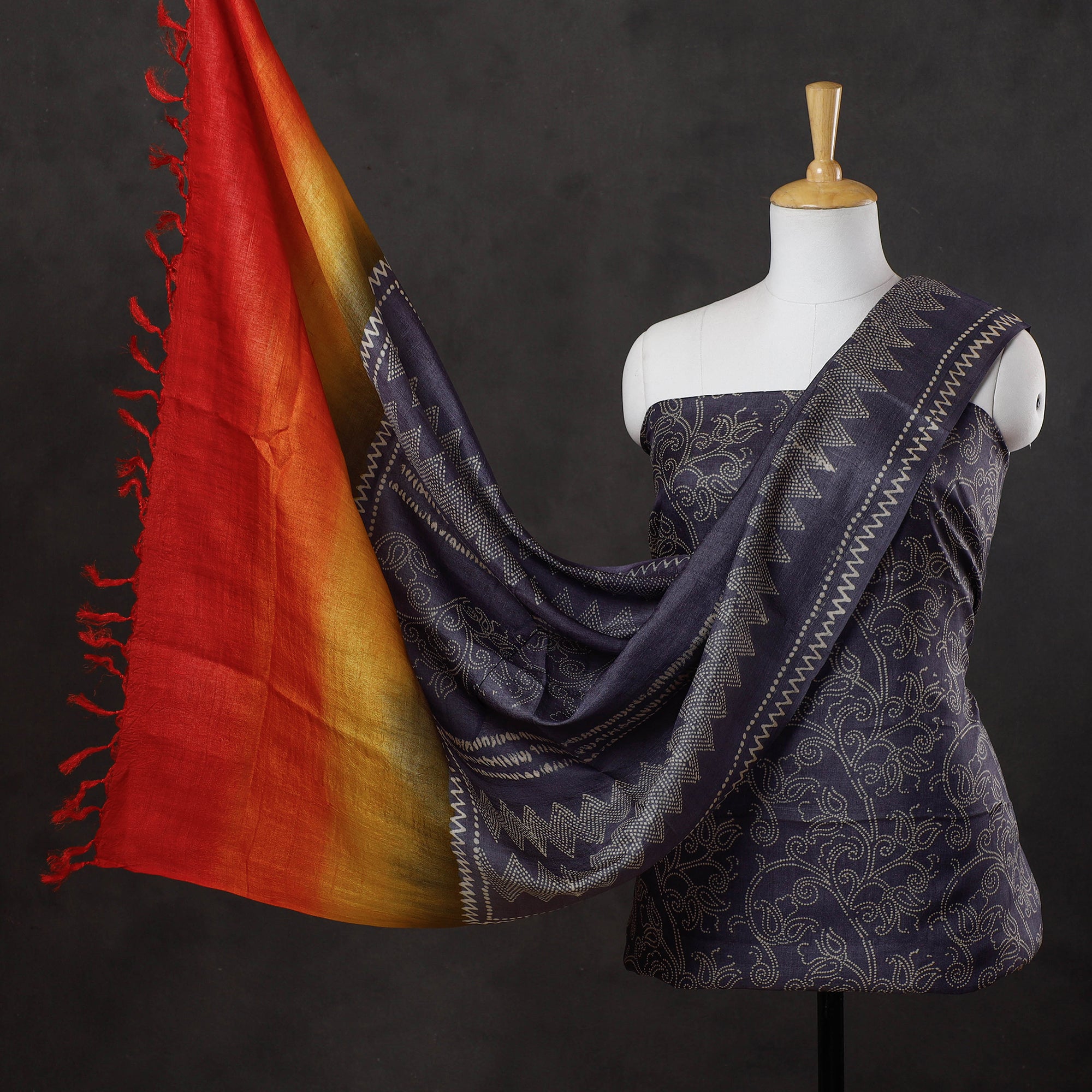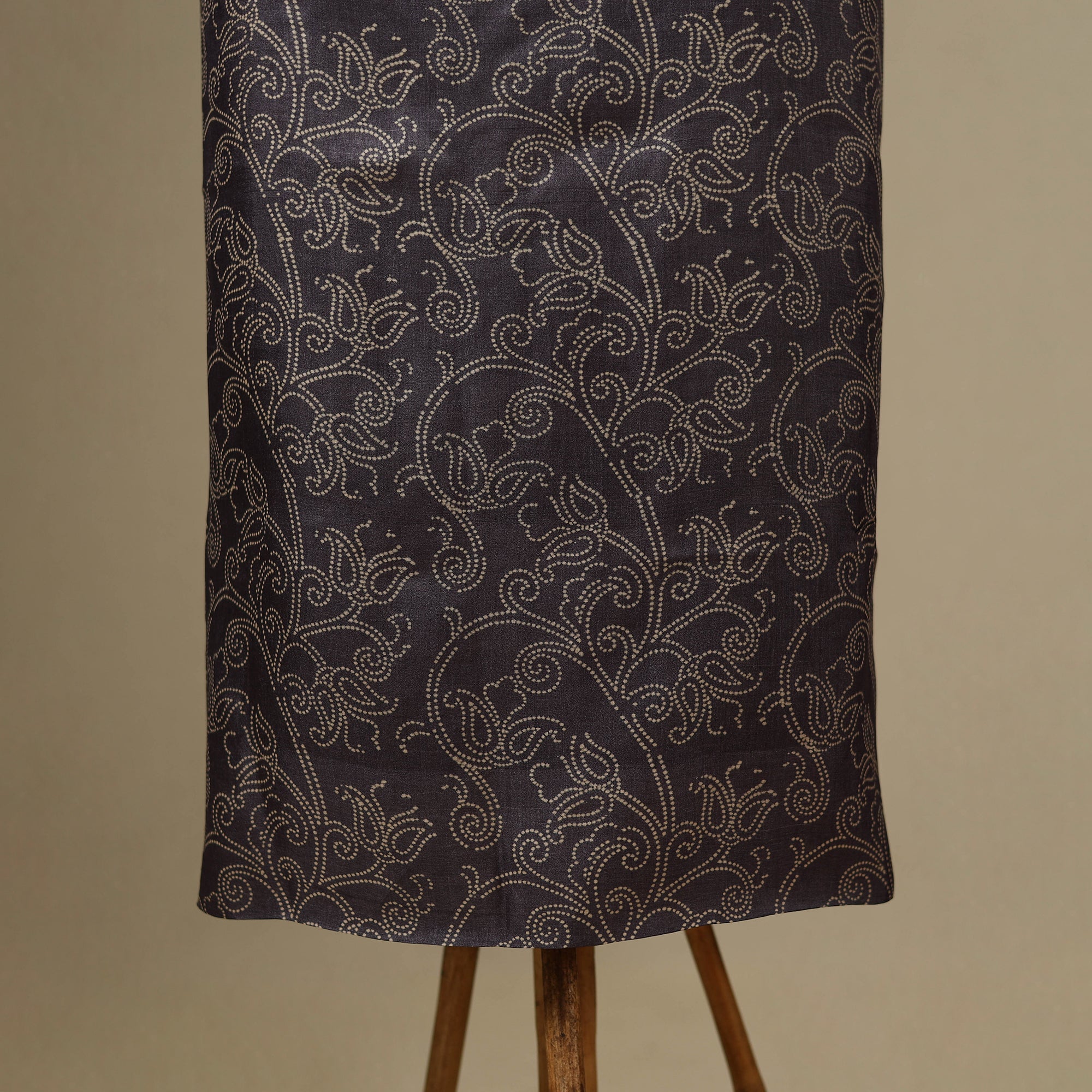 Fine quality black hand block printed tussar silk handloom 2pc suit material set is crafted from high quality tussar silk known for its unique texture sheen, of silk and feel of cotton. This exquisite suit material is meticulously crafted through age-old handloom techniques and adorned with intricate hand block prints, created by skilled artisans using traditional techniques, making it a true work of art. This set is perfect for adding a touch of timeless charm and sophistication to your wardrobe.