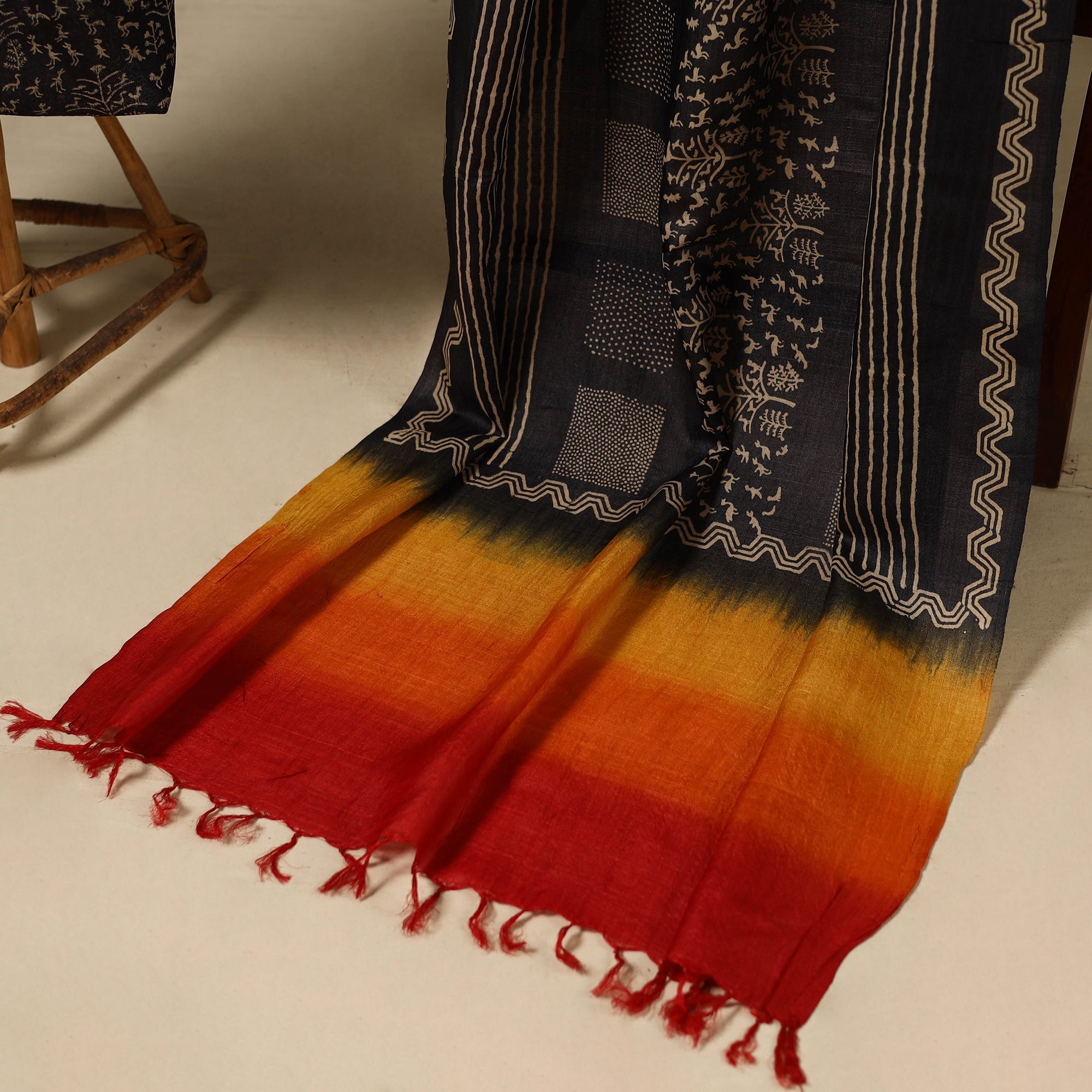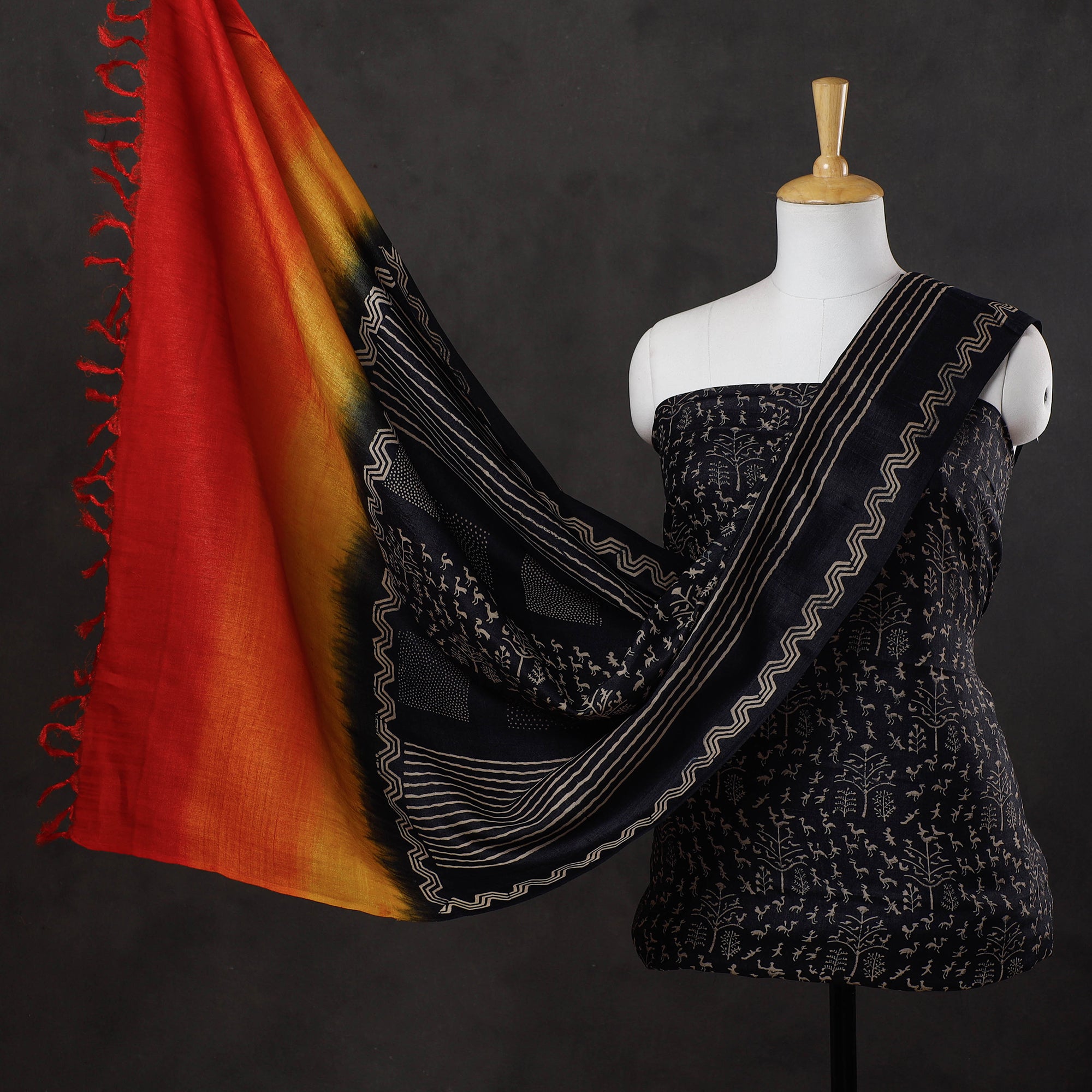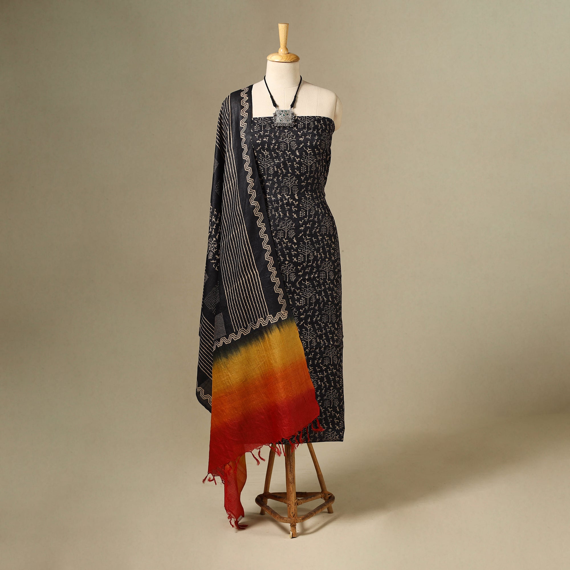 Fine quality black hand block printed tussar silk handloom 2pc suit material set is crafted from high quality tussar silk known for its unique texture sheen, of silk and feel of cotton. This exquisite suit material is meticulously crafted through age-old handloom techniques and adorned with intricate hand block prints, created by skilled artisans using traditional techniques, making it a true work of art. This set is perfect for adding a touch of timeless charm and sophistication to your wardrobe.
