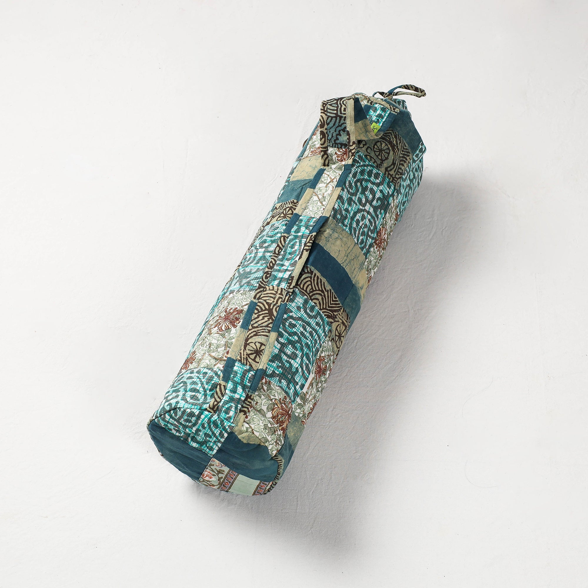 Fine quality green handcrafted patchwork yoga mat bag by jugaad made of cotton fabrics. This yoga mat bag features a long strap for carrying ease, cotton fabric lining inside and one zipper pocket at outside of bag.