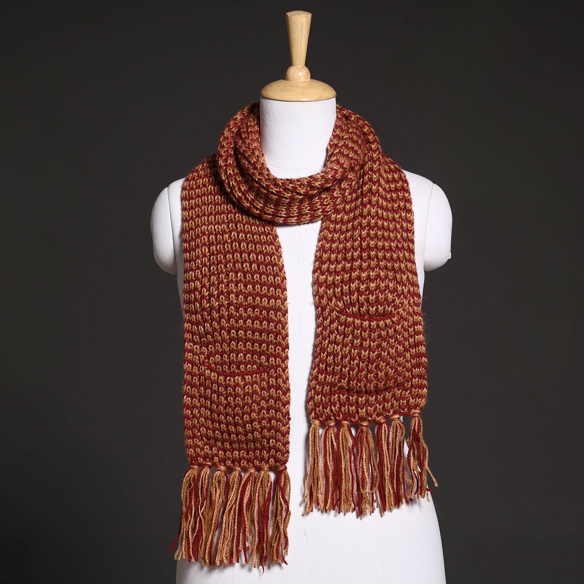 Elevate your winter ensemble with kilmora's brown hand-knitted woolen muffler featuring convenient pockets. Made out of acrylic wool, this muffler has been hand knitted by artisans in Buribana in Kumaon, Uttarakhand. This multifunctional accessory not only keeps you cozy but also adds a touch of traditional charm and practicality to your cold-weather attire. Kilmora uses traditional techniques with contemporary design sensibilities to create a constantly evolving collection using acrylic wool or natural fibers and hand-spun wool.