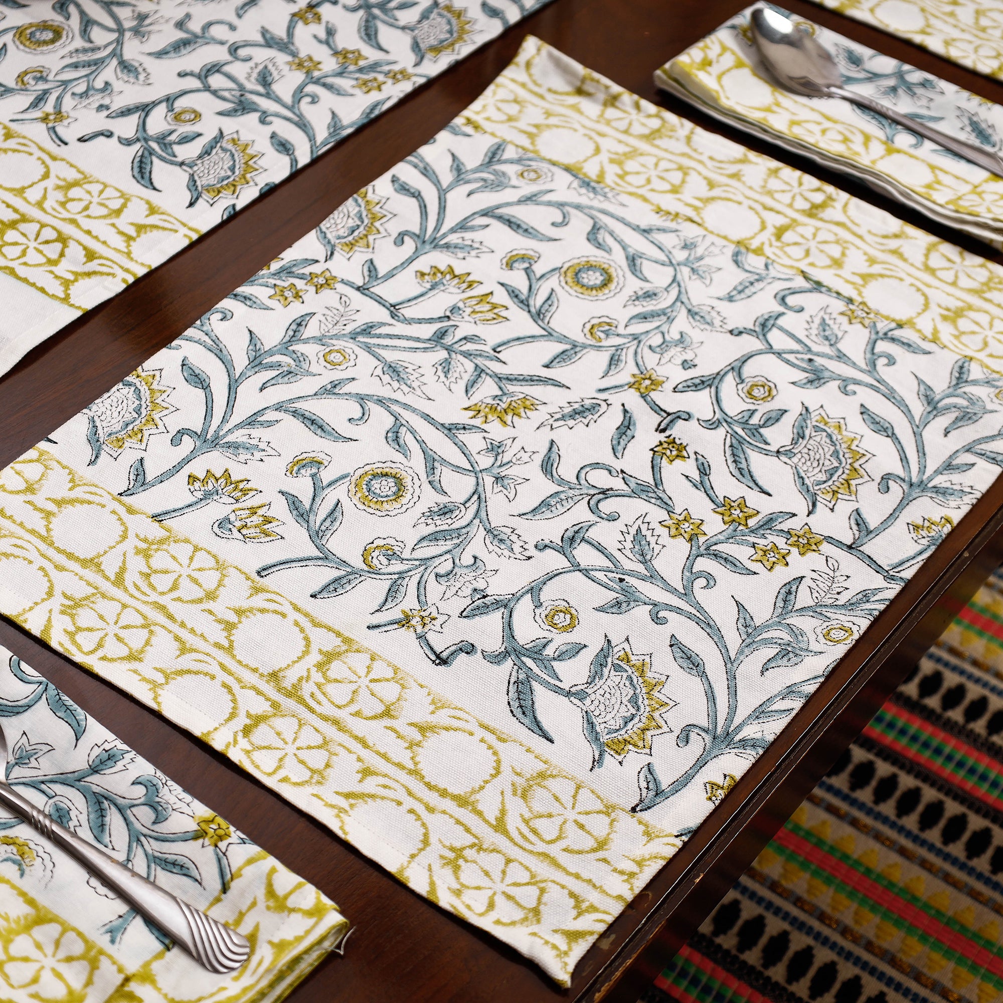 Elevate your dining experience with our exquisite grey sanganeri hand block-printed cotton table runner, table mats, and napkins set. Crafted using the traditional hand-block printing technique from Sanganer, Jaipur, each piece showcases intricate designs and vibrant colors. Made with bleed-free VAT dyes, these high-quality textiles add elegance and charm to any dining table.