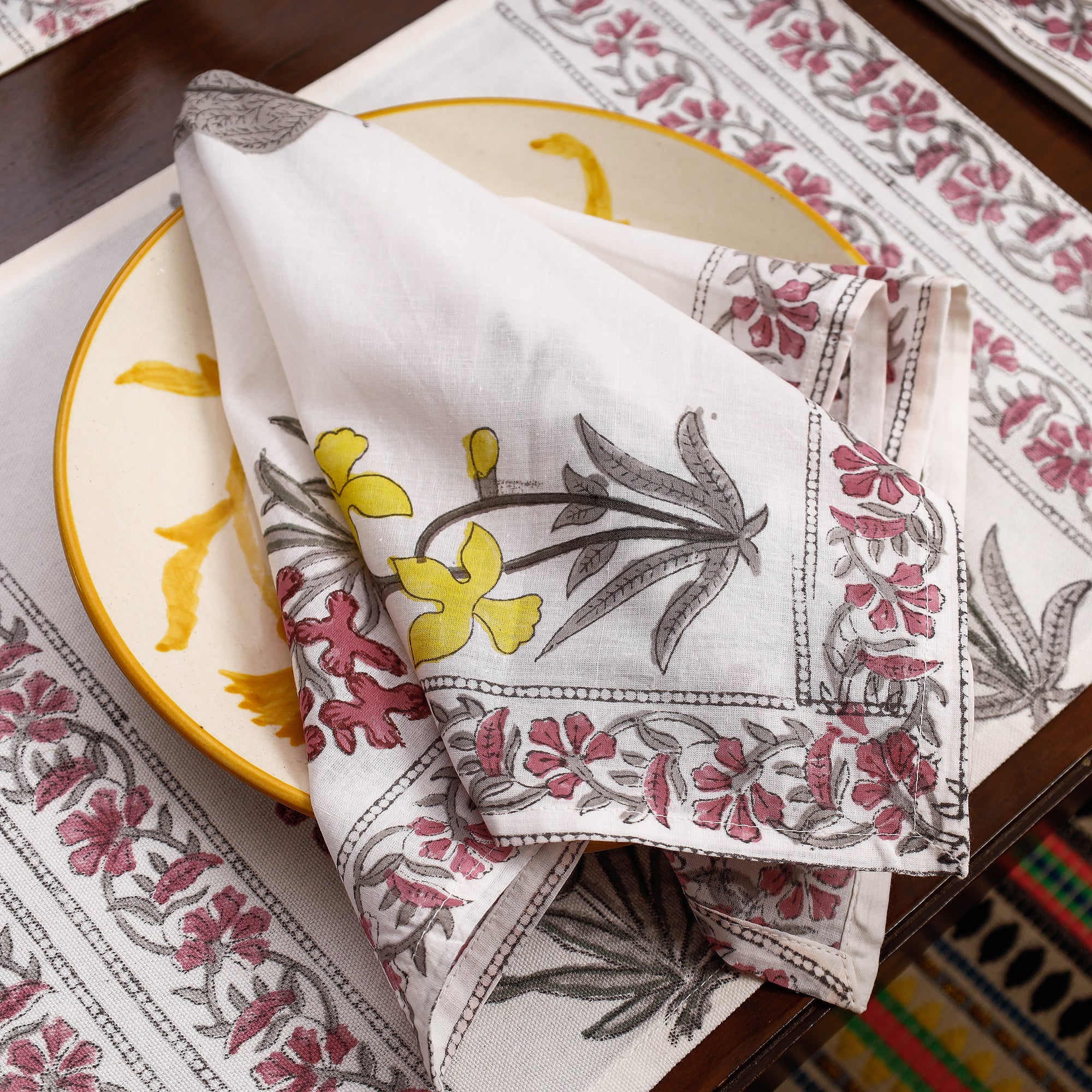 Elevate your dining experience with our exquisite white sanganeri hand block-printed cotton table runner, table mats, and napkins set. Crafted using the traditional hand-block printing technique from Sanganer, Jaipur, each piece showcases intricate designs and vibrant colors. Made with bleed-free VAT dyes, these high-quality textiles add elegance and charm to any dining table.