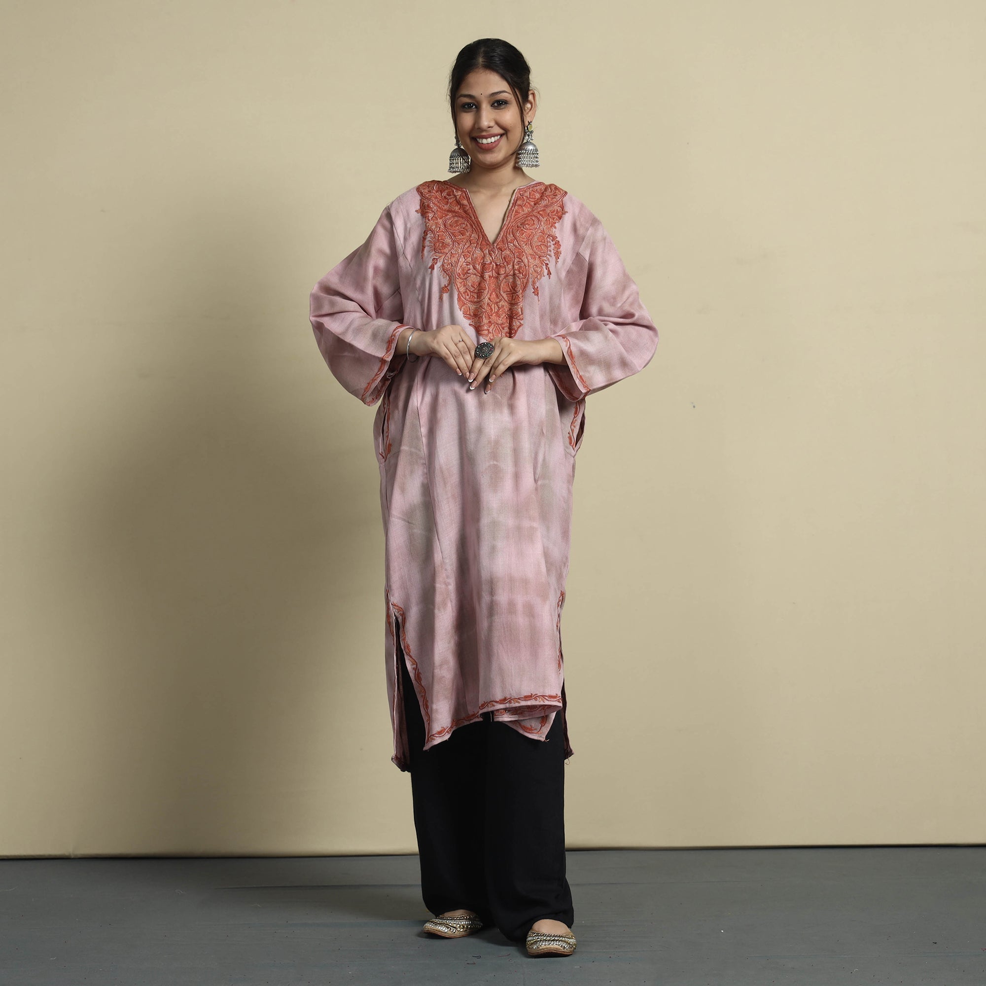 | Material | Finest quality traditional Kashmiri aari hand embroidery shibori tie-dye poly woolen pheran by Zahoor Ahmed from Harwan, Kashmir. Crafted by skilled Kashmiri artisans, this exquisite piece boasts the comfort of polywool, ensuring coziness in winter. Adorned with intricate Aari hand embroidery, it narrates a tale of cultural richness and craftsmanship, while the two side pockets add both functionality and flair. Wrap yourself in the elegance of Kashmiri tradition with the pheran's timeless design. Versatile and comfortable, it can be effortlessly styled for various occasions, making a statement in cultural fashion. |