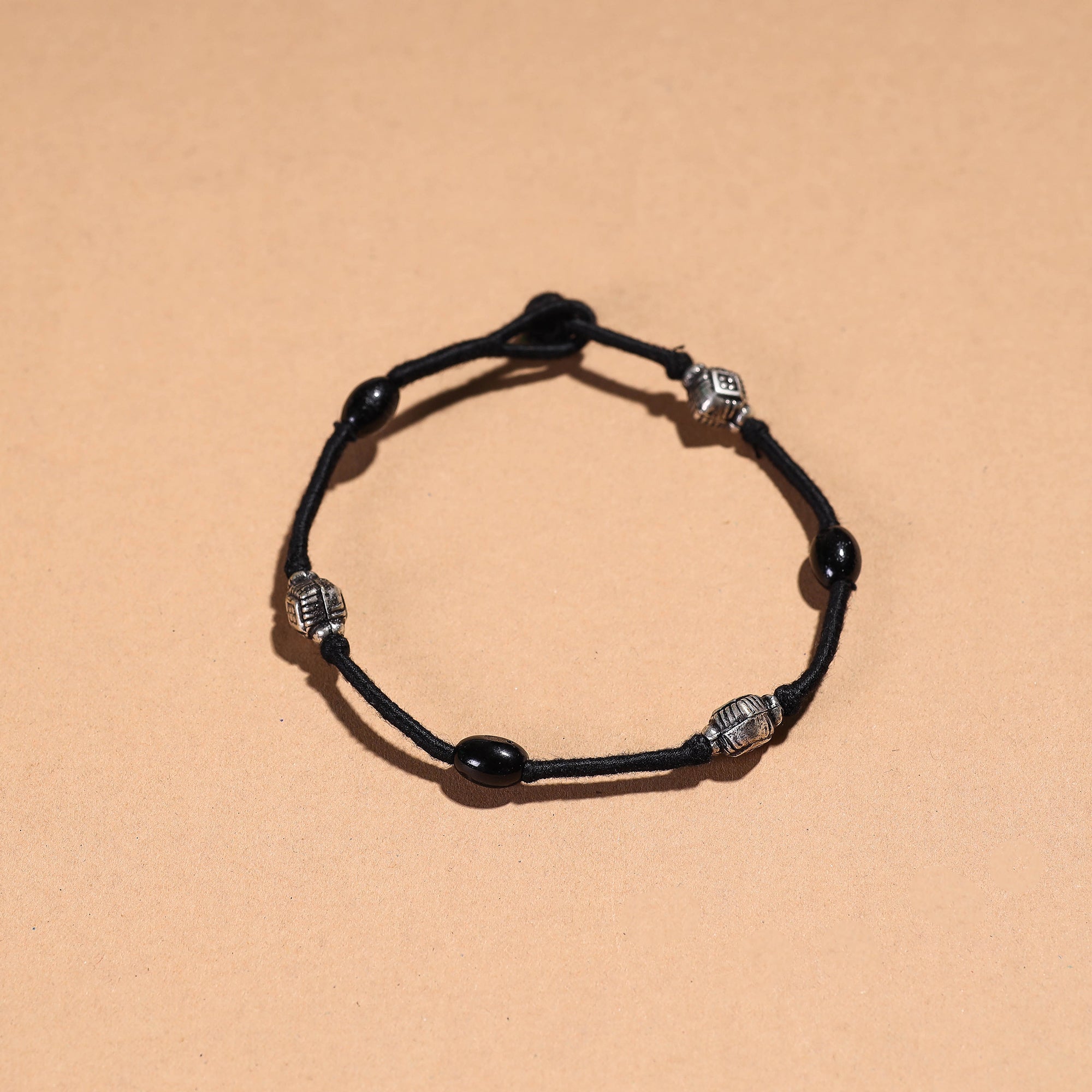 This black handcrafted beads & thread work patwa anklet. This patwa anklet is made from thick weaves of thread with ghungroo work, handcrafted by the master craftsman Kailash Patwa. Patwa is a thread craft that originated in Rajasthan and is now practised in parts of the state. Perfect for adding a touch of charm to your outfit, it's an ideal choice for casual, beach, or festival wear.
