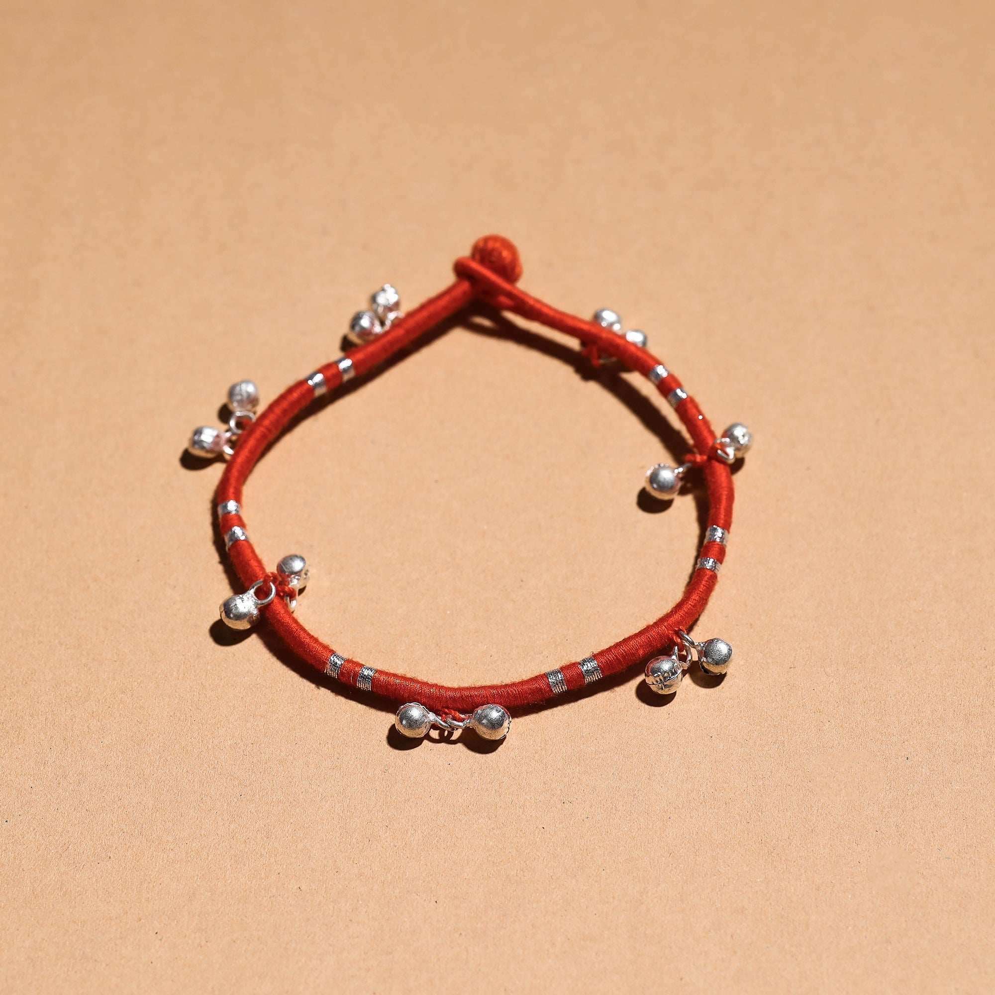 This orange handcrafted ghungroo & thread work patwa anklet. This patwa anklet is made from thick weaves of thread with ghungroo work, handcrafted by the master craftsman Kailash Patwa. Patwa is a thread craft that originated in Rajasthan and is now practised in parts of the state. Perfect for adding a touch of charm to your outfit, it's an ideal choice for casual, beach, or festival wear.