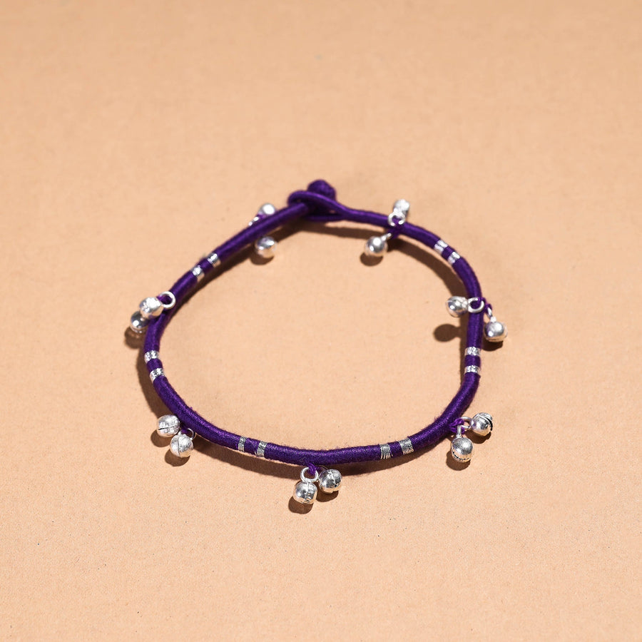 Purple patwa anklet is made from thick weaves of thread and ghungroo work, handcrafted by the master craftsmen kailash patwa. Thick weaves of vibrant thread adorned with ghungroo work create a unique and eye-catching accessory. Perfect for adding a touch of bohemian charm to your outfit, it's an ideal choice for casual, beach, or festival wear. Patwa is a thread craft that originated in Rajasthan and is now practised in parts of the state. Patwa is derived from the Hindi word 'pat,' which means silk, and those involved in the silk and cotton thread business are known as Patwas.