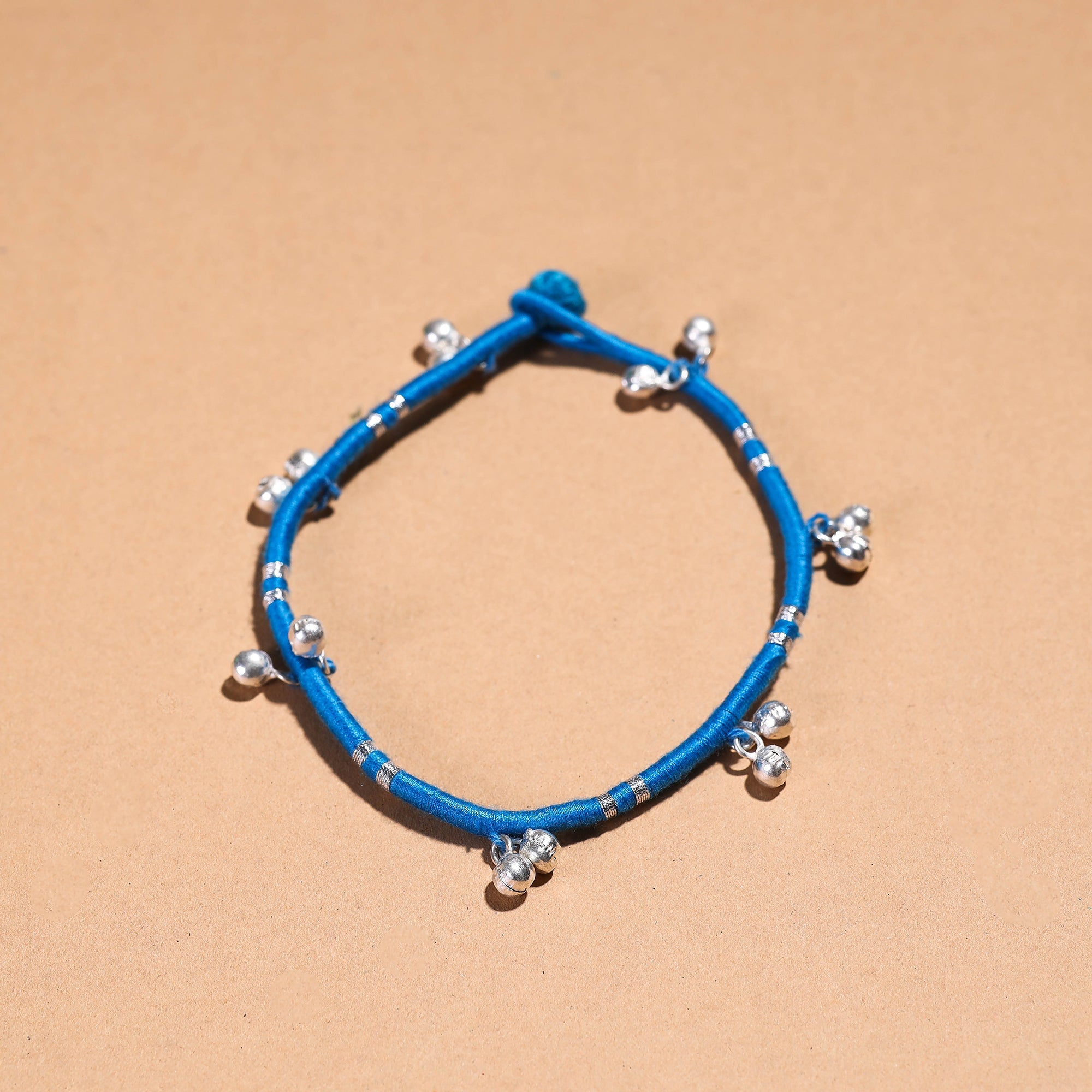 Blue patwa anklet is made from thick weaves of thread and ghungroo work, handcrafted by the master craftsmen kailash patwa. Thick weaves of vibrant thread adorned with ghungroo work create a unique and eye-catching accessory. Perfect for adding a touch of bohemian charm to your outfit, it's an ideal choice for casual, beach, or festival wear. Patwa is a thread craft that originated in Rajasthan and is now practised in parts of the state. Patwa is derived from the Hindi word 'pat,' which means silk, and those involved in the silk and cotton thread business are known as Patwas.