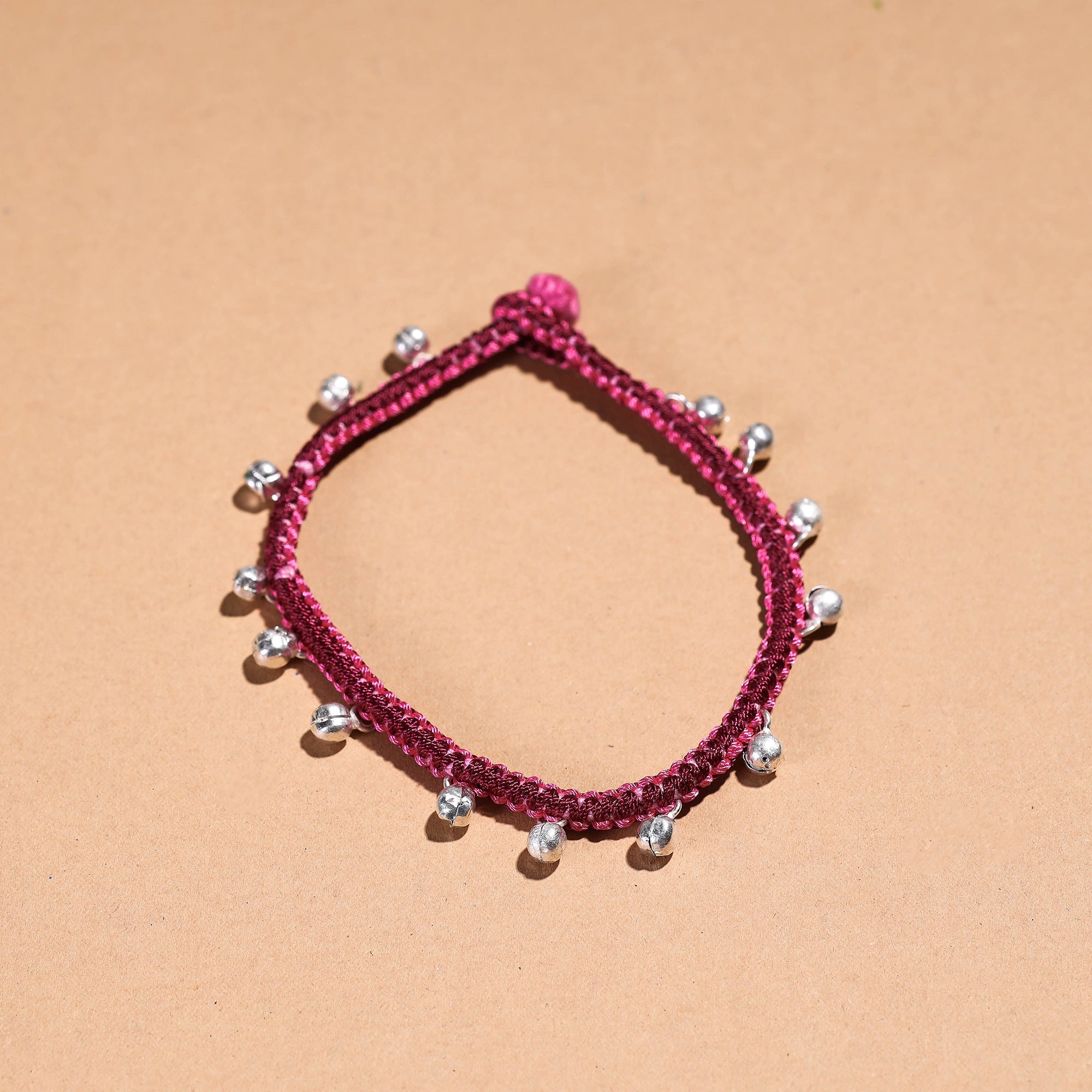 Pink patwa anklet is made from thick weaves of thread and ghungroo work, handcrafted by the master craftsmen kailash patwa. Thick weaves of vibrant thread adorned with ghungroo work create a unique and eye-catching accessory. Perfect for adding a touch of bohemian charm to your outfit, it's an ideal choice for casual, beach, or festival wear. Patwa is a thread craft that originated in Rajasthan and is now practised in parts of the state. Patwa is derived from the Hindi word 'pat,' which means silk, and those involved in the silk and cotton thread business are known as Patwas.