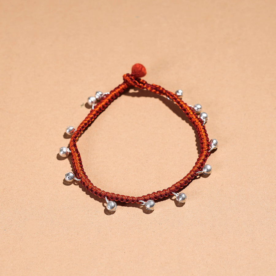 Orange patwa anklet is made from thick weaves of thread and ghungroo work, handcrafted by the master craftsmen kailash patwa. Thick weaves of vibrant thread adorned with ghungroo work create a unique and eye-catching accessory. Perfect for adding a touch of bohemian charm to your outfit, it's an ideal choice for casual, beach, or festival wear. Patwa is a thread craft that originated in Rajasthan and is now practised in parts of the state. Patwa is derived from the Hindi word 'pat,' which means silk, and those involved in the silk and cotton thread business are known as Patwas.