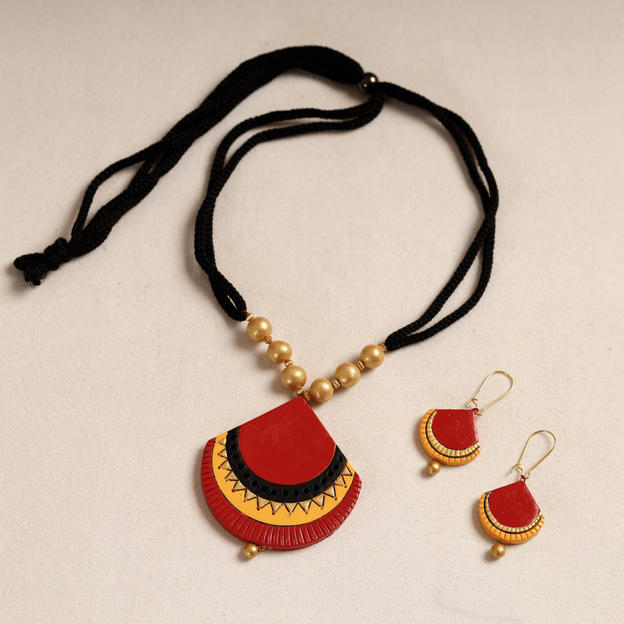 Elevate your style with our exquisite red hand-painted terracotta necklace set, a masterpiece crafted by skilled Bishnupur artisans. Each piece is adorned with vibrant acrylic colours, reflecting the region's artistic heritage. This exquisite set, complete with matching earrings, adds a touch of cultural charm to any outfit. This exquisite set not only enhances your style but also reflects the cultural richness of Bishnupur.