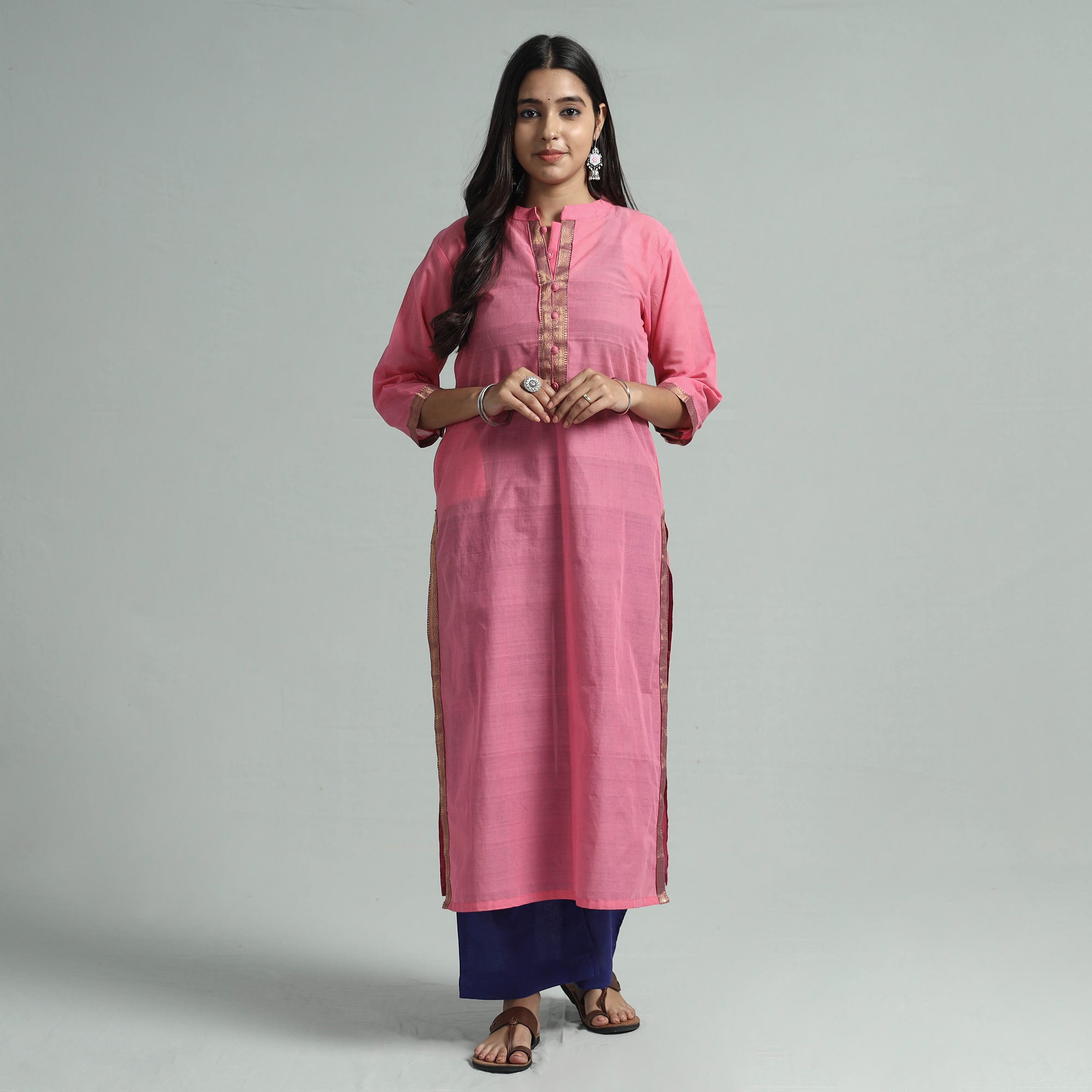 Look and feel beautiful in this uniquely designed mangalagiri handloom cotton long kurta with palazzo and dupatta set. This kurta set is crafted from handloom cotton fabric, ensuring a comfortable feel against your skin. The kurta also features a convenient one-side pocket, perfect for carrying small essentials, and the palazzo features an elasticized waist and two side pockets, adding functionality to this palazzo. It boasts an exquisite zari design, adding a touch of elegance to your ensemble. It's an ideal choice for both casual and festive occasions.