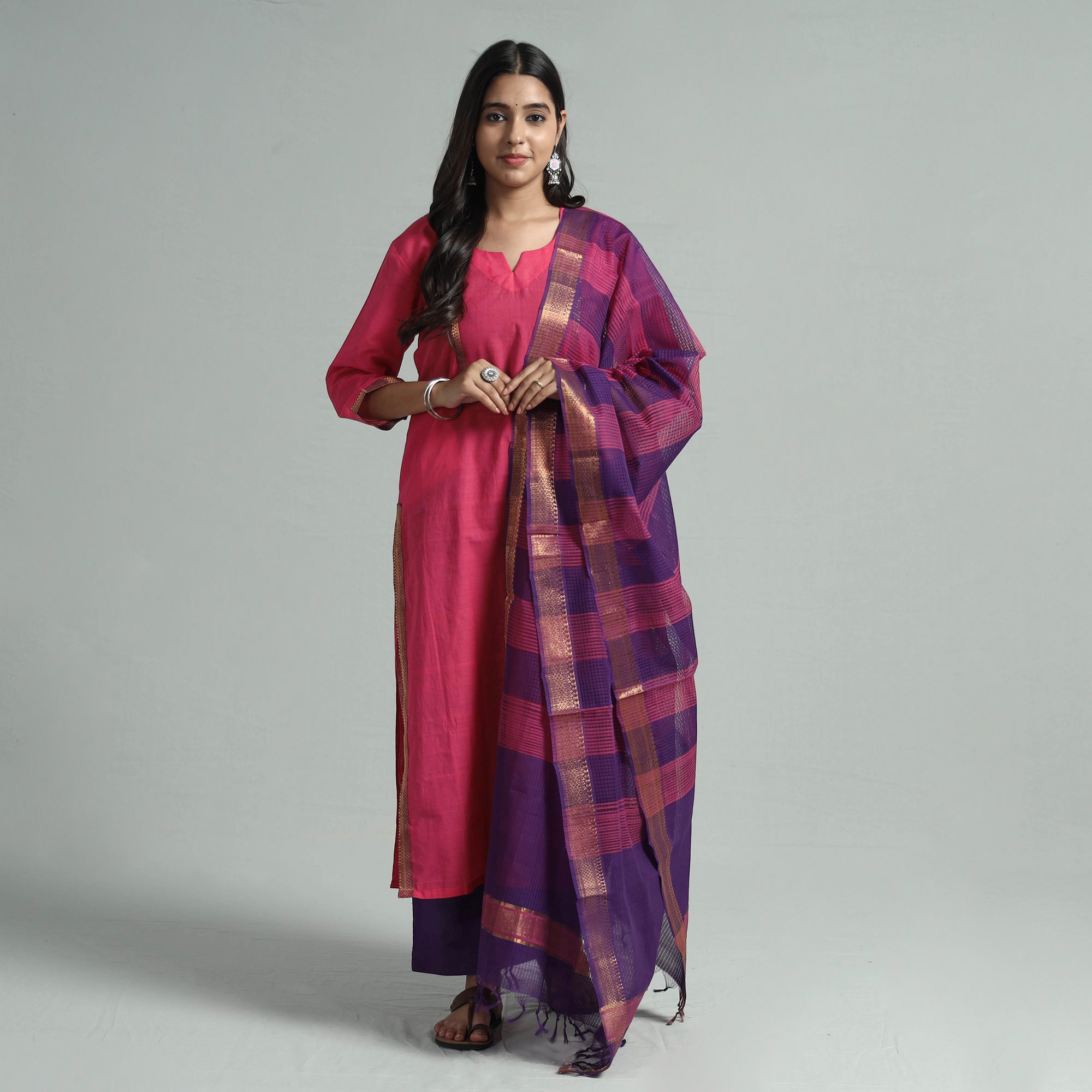 Look and feel beautiful in this uniquely designed mangalagiri handloom cotton long kurta with palazzo and dupatta set. This kurta set is crafted from handloom cotton fabric, ensuring a comfortable feel against your skin. The kurta also features a convenient one-side pocket, perfect for carrying small essentials, and the palazzo features an elasticized waist and two side pockets, adding functionality to this palazzo. It boasts an exquisite zari design, adding a touch of elegance to your ensemble. It's an ideal choice for both casual and festive occasions.