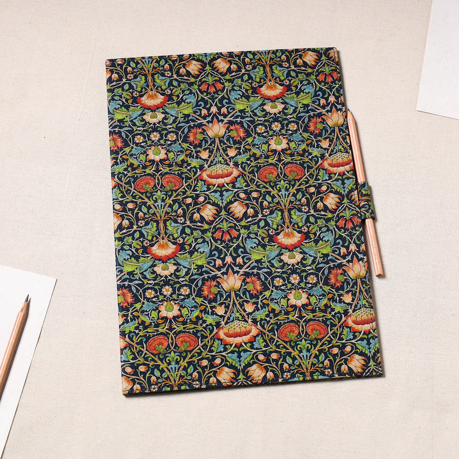 Elevate your organizational style with our multicolor handcrafted floral-printed file folder with pencil. This file folder is crafted from sturdy cardboard and adorned with screen-printed cotton fabric; it exudes charm. Secured by a rustic pencil closure, this file folder features two internal pockets for seamless paper and document storage. Embrace functionality and elegance as you transport your papers with flair.