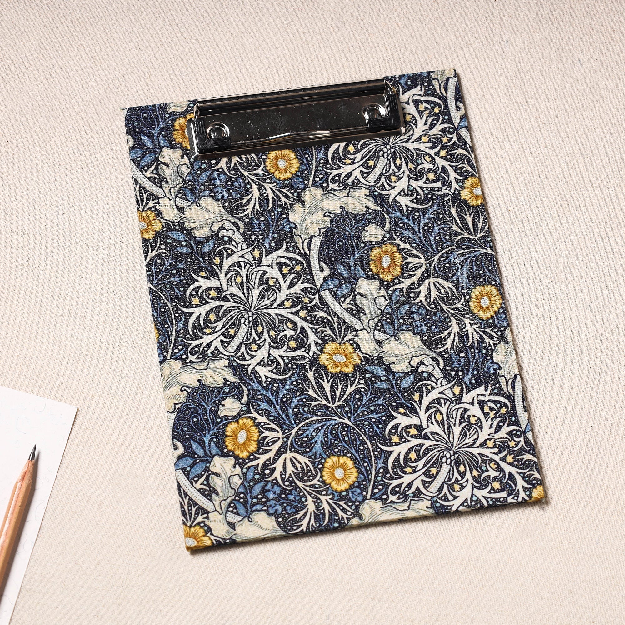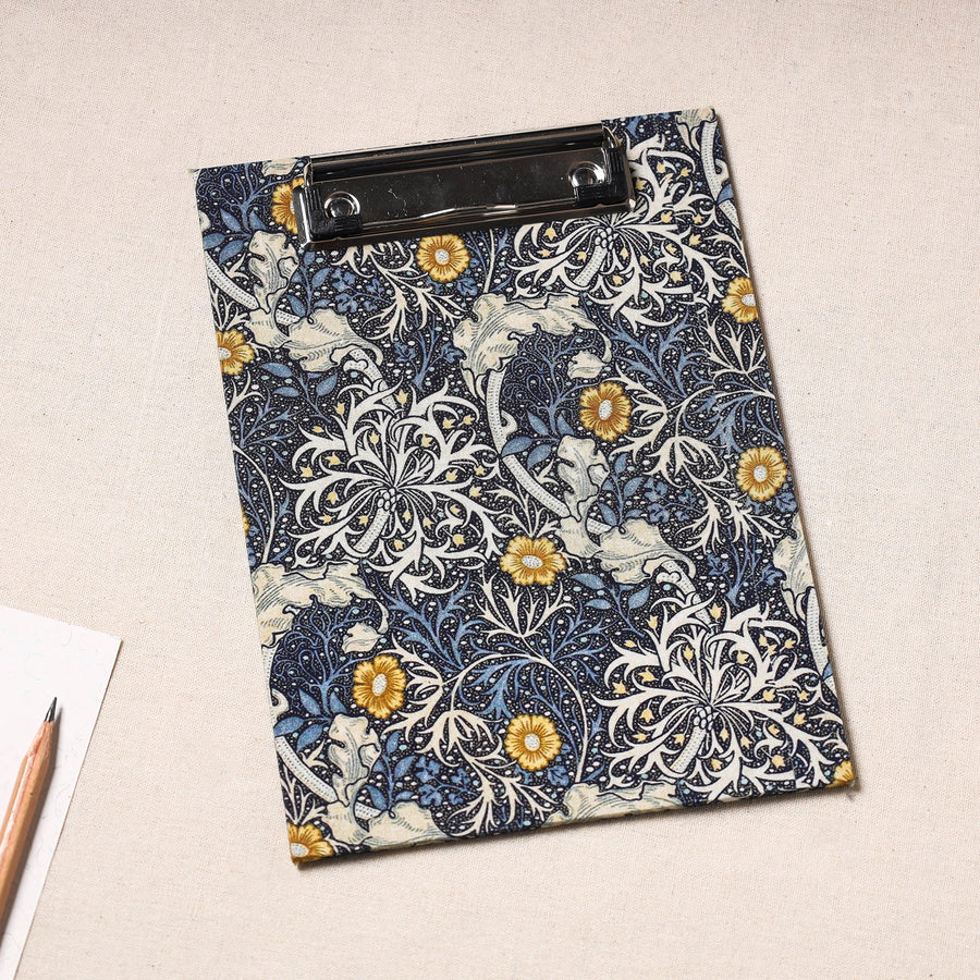 Elevate your workspace with our exquisite handcrafted floral-printed clipboard. This clipboard is crafted from durable hardboard, adorned with screen-printed cotton fabric, and featuring a robust metal clip, it seamlessly combines style and functionality. Perfect for any purpose, this clipboard adds a touch of sophistication to your note-taking, sketches, or document handling.