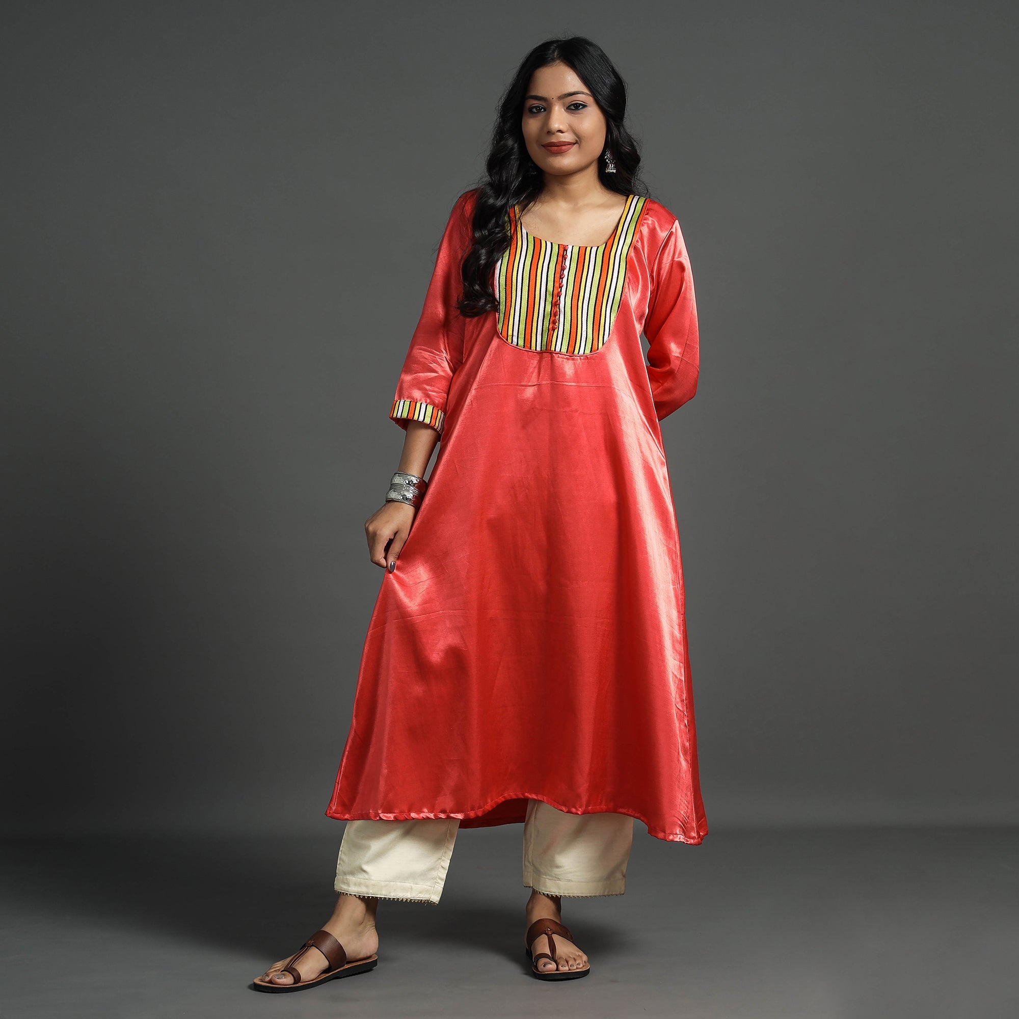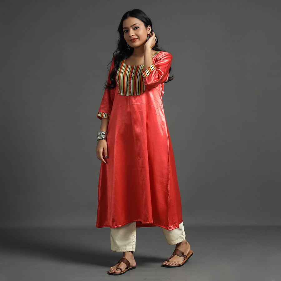 Look and feel beautiful in this uniquely designed plain mashru silk with patchwork floral kurta. This straight kurta is crafted from blend of mashru fibers and silk yarns, It boasts a soft, shiny, and highly lustrous texture. The soft and delicately textured weave ensures a pleasant feel against the skin. The kurta also features a convenient one-side pocket, perfect for carrying small essentials. It's an ideal choice for both casual and festive occasions.