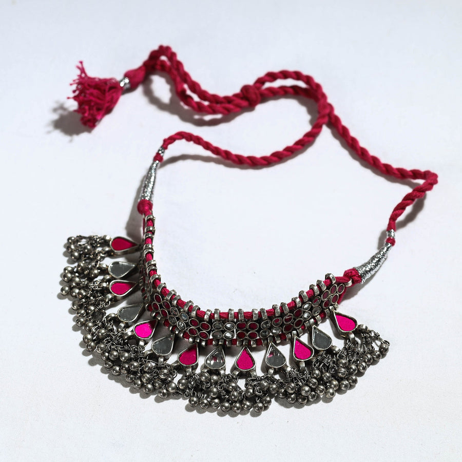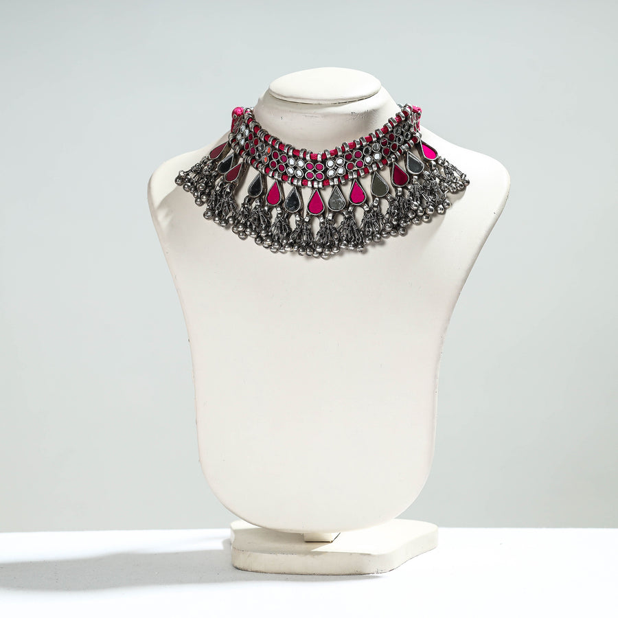 Grey handmade necklace made with high-quality german silver glass work necklace with ghungroo. An antique finish on a silver necklace can give it a timeless and vintage look. It often involves intentionally darkening the metal to create an aged appearance, which can enhance the intricate details of the design. Each piece is unique and made with utmost perfection.
